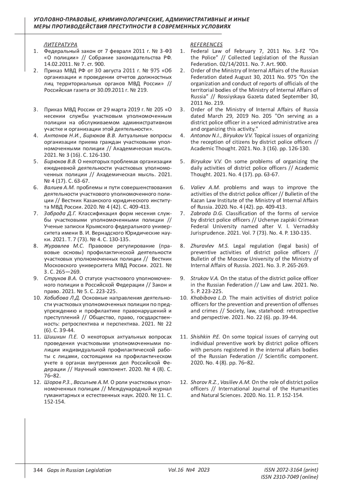 10. Хабибова Л.Д. Основные направления деятельности участковых уполномоченных полиции по предупреждению и профилактике правонарушений и преступлений // Общество, право, государственность: ретроспектива и перспектива. 2021. № 22 (6). С. 39-44. EDN: AHGDEI