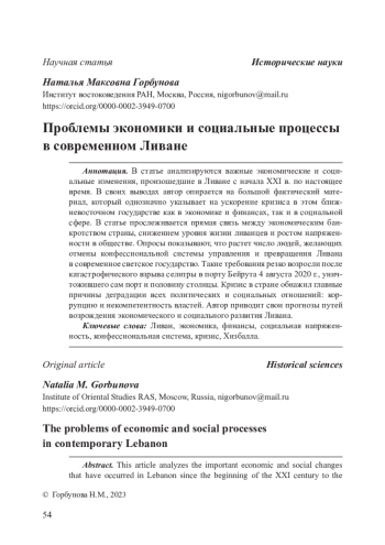 В статье анализируются важные экономические и социальные изменения, произошедшие в Ливане с начала XXI в. по настоящее время. В своих выводах автор опирается на большой фактический материал, который однозначно указывает на ускорение кризиса в этом ближневосточном государстве как в экономике и финансах, так и в социальной сфере. В статье прослеживается прямая связь между экономическим банкротством страны, снижением уровня жизни ливанцев и ростом напряженности в обществе. Опросы показывают, что растет число людей, желающих отмены конфессиональной системы управления и превращения Ливана в современное светское государство. Такие требования резко возросли после катастрофического взрыва селитры в порту Бейрута 4 августа 2020 г., уничтожившего сам порт и половину столицы. Кризис в стране обнажил главные причины деградации всех политических и социальных отношений: коррупцию и некомпетентность властей. Автор приводит свои прогнозы путей возрождения экономического и социального развития Ливана.