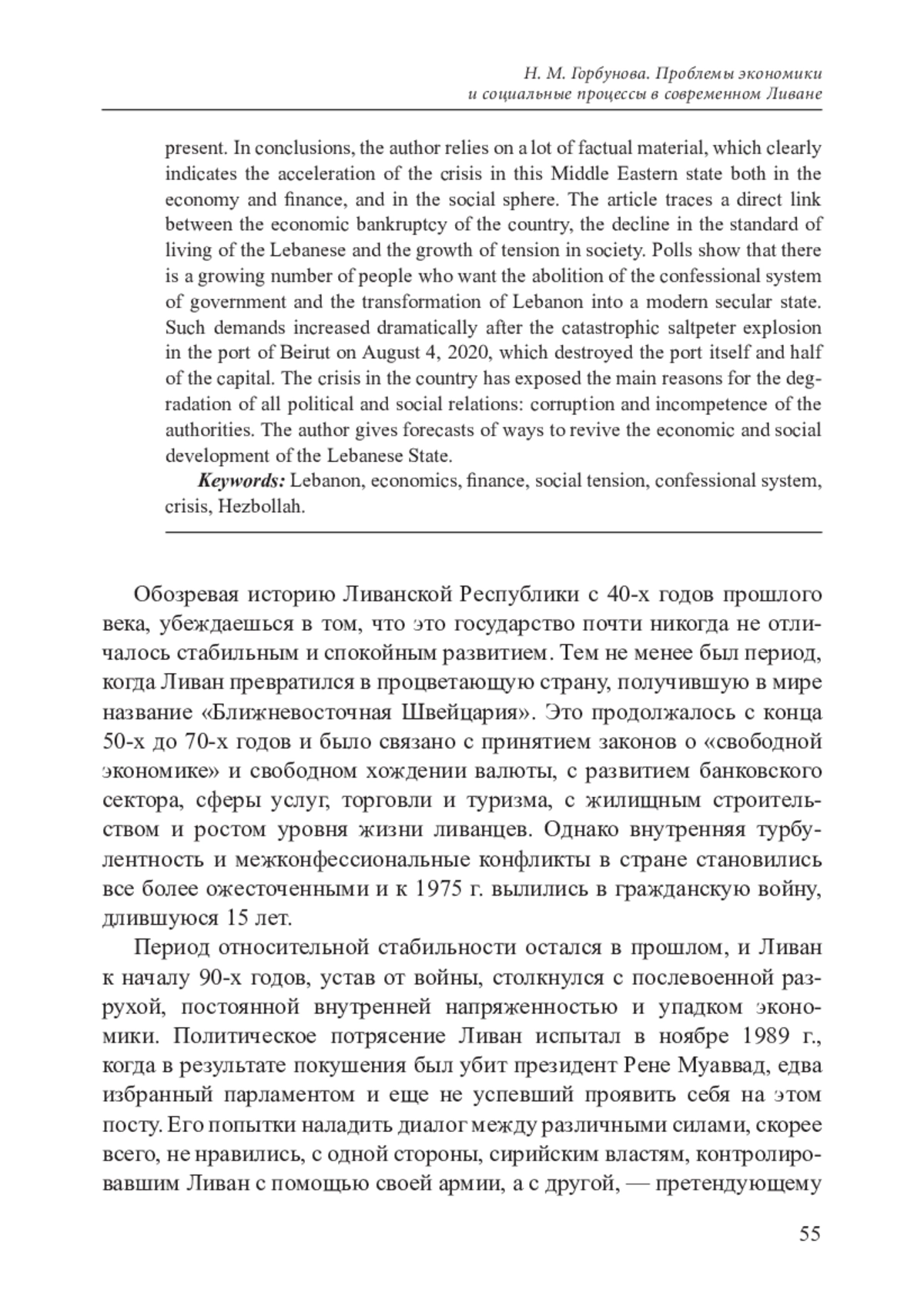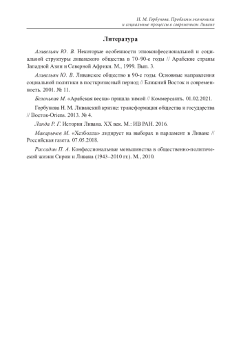 4. Горбунова Н. М. Ливанский кризис: трансформация общества и государства // Восток-Oriens. 2013. № 4. Ланда Р. Г. История Ливана. ХХ век. М.: ИВ РАН. 2016. EDN: RESGEF