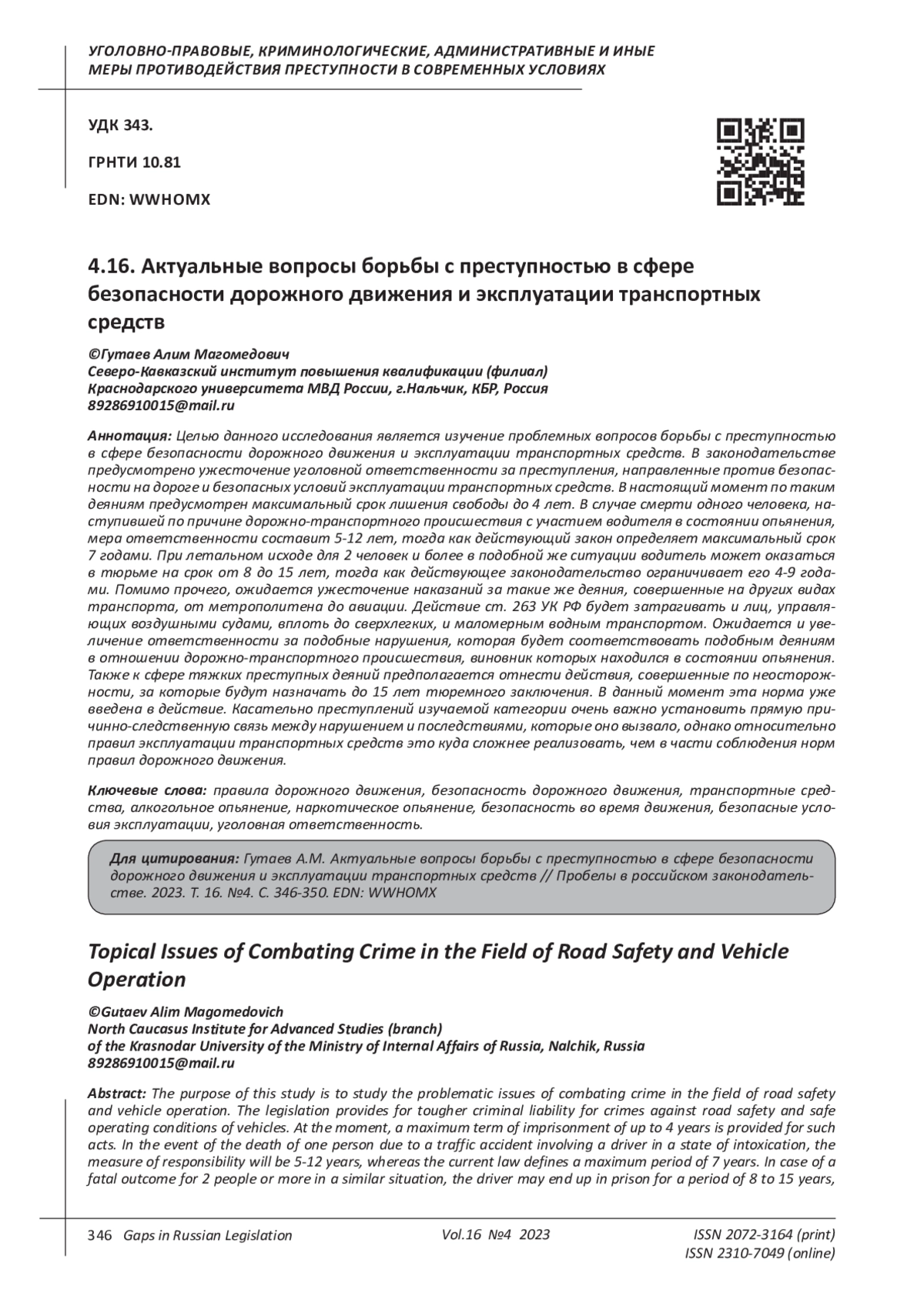 6. Гутаев А.М. Правовые основы предупреждения преступлений в сфере безопасности дорожного движения // Пробелы в российском законодательстве. 2021. Т. 14. №3. С. 154-157. EDN: OAWJZU