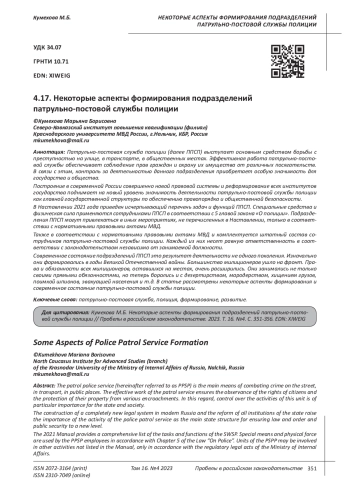 В каждой стране создаются специальные органы, главной целью которых является осуществление защиты прав граждан, охрана правопорядка и законности на территории страны. Значение деятельности данных структур переоценить невозможно, так как без осуществления охраны правопорядка и законности, ни одно государство не может функционировать в должном виде. Защита законности и правопорядка в стране во многом зависит от эффективности работы патрульно-постовых служб полиции, являющихся главным средством обеспечения борьбы с правонарушениями и преступлениями. Патрульно-постовая служба обеспечивает правопорядок не только на улицах, в парках, на рынках, в местах скопления людей, но также осуществляет правопорядок на железнодорожном транспорте, водном транспорте, В их обязанности входит: контроль за соблюдением правил дорожного движения, сохранение неизменным мест совершения преступлений, выявление несовершеннолетних, попавших в сложные жизненные ситуации и т. д. Список обязанностей сотрудников ППСП очень обширен и разнообразен. Их работу ни в коем случае нельзя назвать легкой и незаметной. Именно от качества их службы напрямую зависит защита прав и свобод граждан и их имущества. Видя значимость и многообразие деятельности сотрудников патрульно-постовой службы, еще большее недоумение вызывает негативное отношение граждан к ним. Безусловно, в стране совершается большое количество преступлений и правонарушений, которые было возможно предотвратить и пресечь. В данной ситуации виноваты не только сотрудники полиции, не предотвратившие их совершение, но и сами граждане, отказывающиеся часто сотрудничать с полицией и считающие правильным замалчивать и даже не замечать противоправное поведение других граждан. Высокий уровень совершаемых правонарушений и преступлений является виной и самих сотрудников ППСП, которые должным образом не выполнили свои служебные обязанности по защите прав граждан и их имущества. Вышесказанное свидетельствует об актуальности выбранной темы. Научная статья посвящена организационно-правовым особенностям деятельности патрульно-постовой службы полиции.