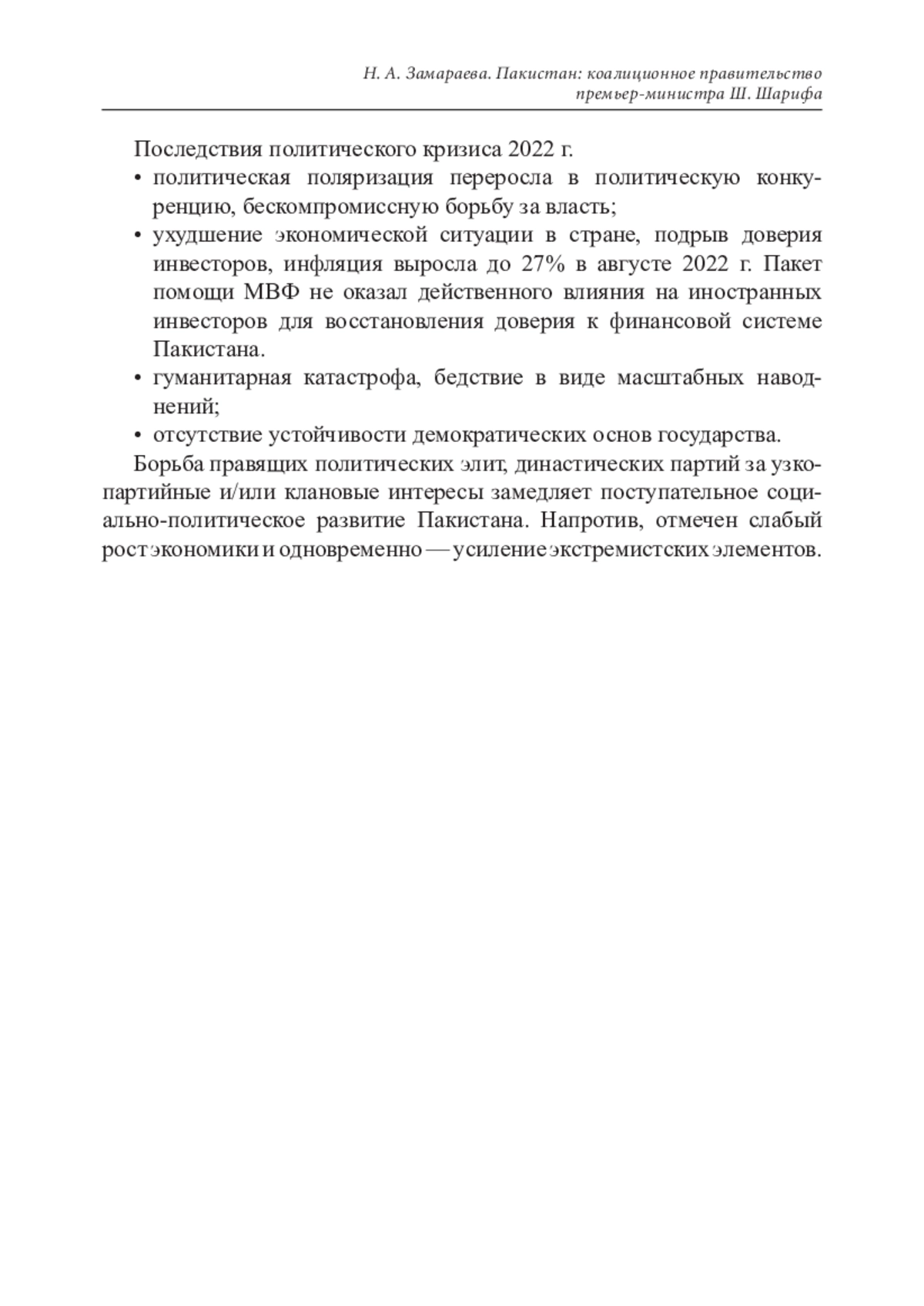 Статья посвящена одной из актуальных тем в новейшей истории Пакистана — анализу причин досрочной отставки в апреле 2022 г. премьер-министра Имран Хана в связи с вотумом недоверия большинства парламентариев. К их числу следует отнести: отказ вести переговоры с оппозицией (2018–2022 гг.), экономический кризис, просчеты во внешней политике, разногласия с военным истеблишментом, противоречия в возглавляемой им партии Техрик-и-Инсаф.