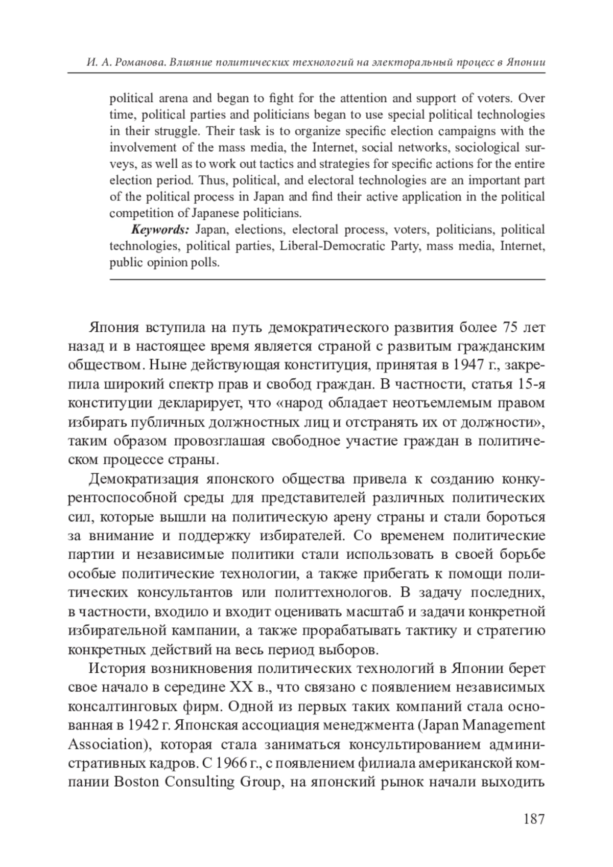 Демократизация японского общества после Второй мировой войны открыла путь для представителей различных политических сил Японии, которые вышли на политическую арену и стали бороться за внимание и поддержку избирателей. Со временем политические партии и политики стали использовать в своей борьбе особые политические технологии. В их задачу входит организовывать конкретные избирательные кампании с привлечением средств массовой информации, Интернета, социальных сетей, социологических опросов, а также прорабатывать тактику и стратегию конкретных действий на весь период выборов. Таким образом, политические и избирательные технологии являются важной частью политического процесса в Японии, и в частности находят свое активное применение в политической конкуренции японских политиков.