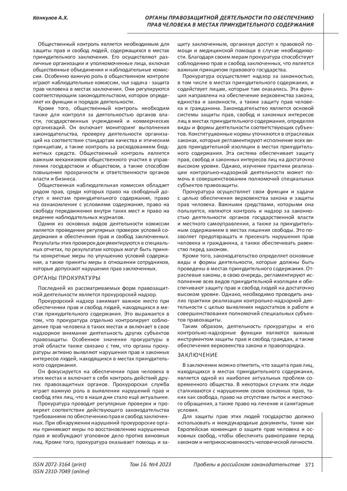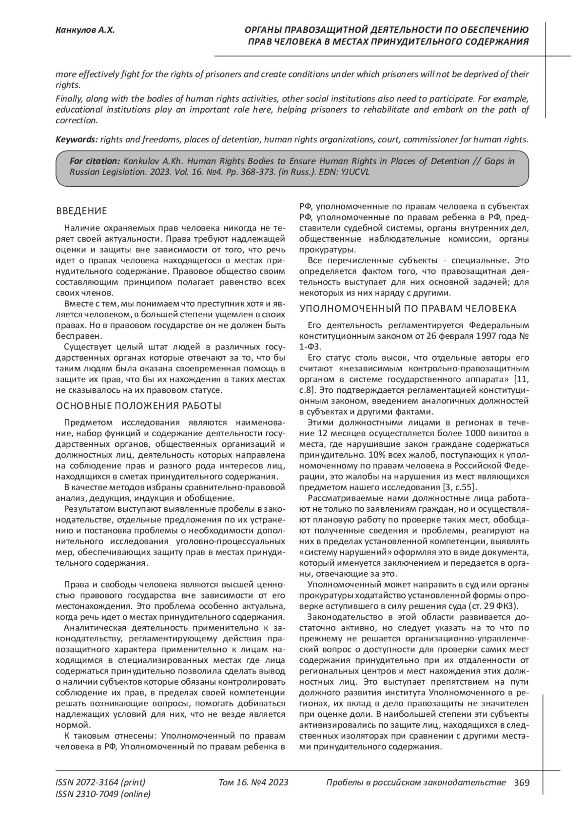 КАНКУЛОВ А. Х. ОРГАНЫ ПРАВОЗАЩИТНОЙ ДЕЯТЕЛЬНОСТИ ПО ОБЕСПЕЧЕНИЮ ПРАВ ЧЕЛОВЕКА В МЕСТАХ ПРИНУДИТЕЛЬНОГО СОДЕРЖАНИЯ // ПРОБЕЛЫ В РОССИЙСКОМ ЗАКОНОДАТЕЛЬСТВЕ. 2023. Т. 16 № 4