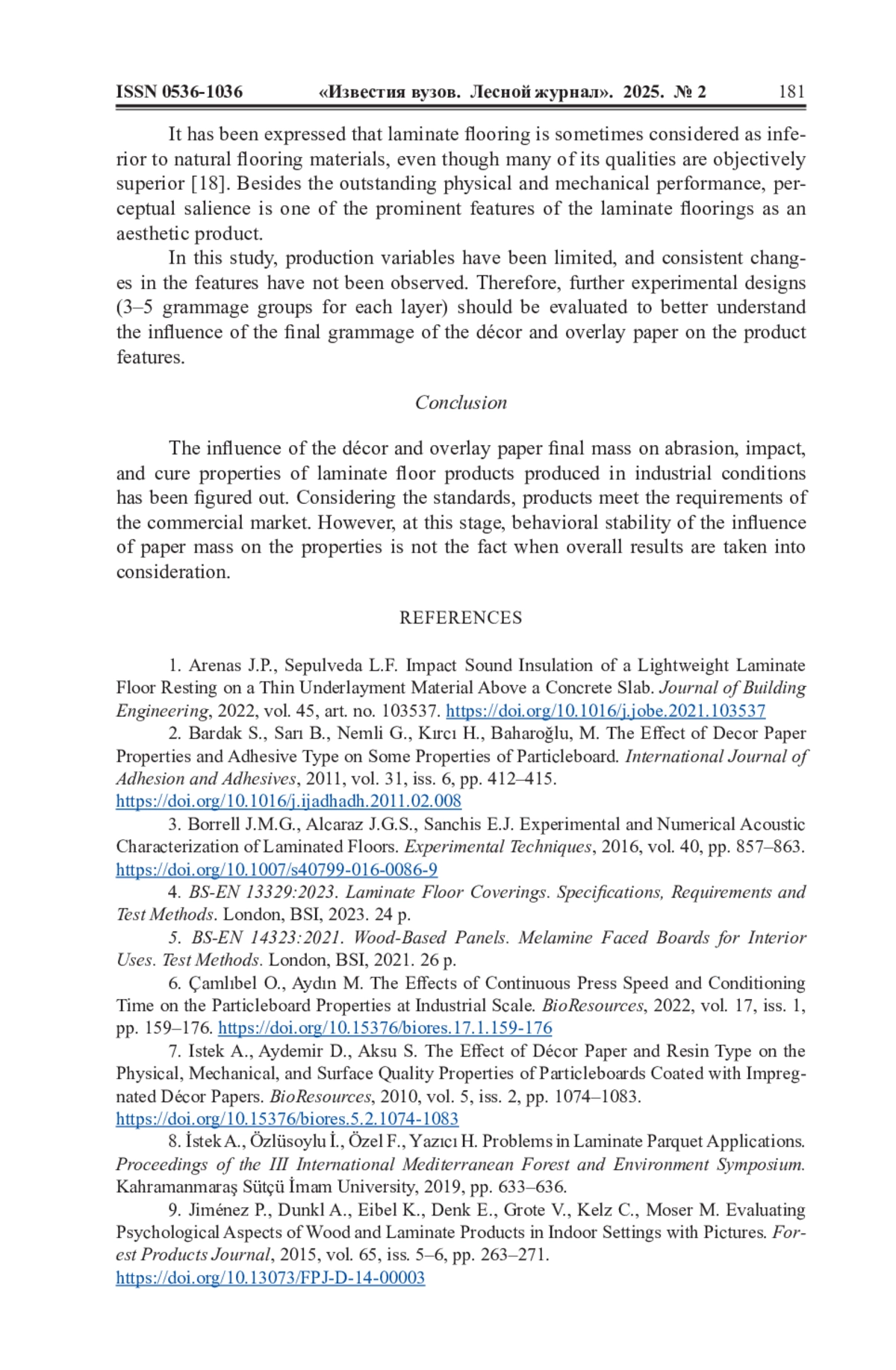 15. Nemli G. Factors Affecting Some Quality Properties of the Decorative Surface Overlays. Journal of Materials Processing Technology, 2008, vol. 195, iss. 1-3, pp. 218-223. DOI: 10.1016/j.jmatprotec.2007.05.001 EDN: KLVESP