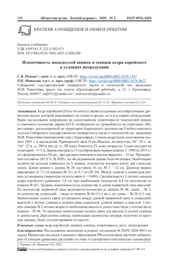 Кедр корейский (Pínus koraiénsis) является ценным лесообразующим древесным видом, который выращивают не только в ареале, но и в условиях интродукции. Наше исследование направлено на сопоставление изменчивости показателей шишек и семенного потомства дерева КО-9, отобранного по урожайности на плантации «Известковая», расположенной на территории Караульного лесничества Учебно-опытного лесхоза Сибирского государственного университета науки и технологий им. академика М. Ф. Решетнёва (пригородная зона г. Красноярка). Семена кедра были заготовлены осенью 1965 г. в насаждении Приморского края (Тудо-Вакское лесничество; 46° 54’ с. ш. 134° 12’ в. д., 200 м над ур. м.; III класс бонитета, IV класс возраста). Схема посадки на плантации - 5×5 м. Дерево в возрасте 31 год образовало первые шишки. С 1999 по 2013 гг. их сформировалось 80 шт., при среднем значении в данном варианте - 23 шт. Превышение составило 247,8 %. В 2020 г. на обследованном дереве было 46 шишек. Наибольшее количество всходов появилось из 8 шишек, показатели которых взяты для сопоставления. Длина шишек с дерева No 24 составила 16 см, No 3 - 12 см. Диаметр шишек варьировал от 7,5 см (шишка No 21) до 9,7 см (No 24). Между длиной и диаметром шишек установлена умеренная теснота связи (r = 0,488). Средняя высота 1-летних сеянцев кедра корейского равнялась 3,8 см, при наибольшем показателе 4,4 см (потомство из шишки No 45). Уровень изменчивости по количеству и длине первичной хвои высокий. По количеству первичной хвои выделяется потомство из шишки No 44, длине - No 3; по количеству семядолей - также из шишки No 44 (13,3 шт.), по длине - No 24 (3,3 см). Значительная теснота связи установлена между длиной первичной хвои и семядолей, высотой 1-летних сеянцев и количеством семядолей, длиной шишек и высотой 1-летних сеянцев. В 2-летнем возрасте наибольшая высота и длина хвои были у потомства из шишки - No 44. Установлена значительная теснота связи для высоты 2-летних сеянцев и длины хвои. Двухлетние сеянцы, наибольшее количество которых получено из крупных шишек, были отселектированы по высоте.