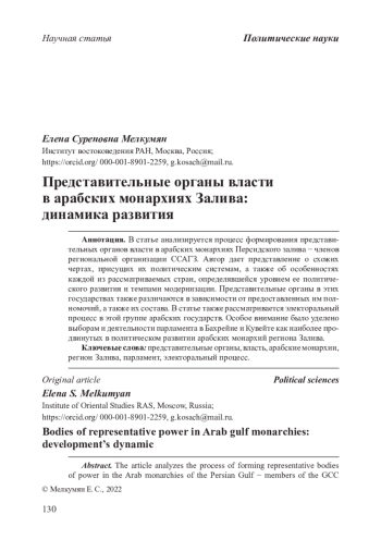 В статье анализируется процесс формирования представительных органов власти в арабских монархиях Персидского залива − членов региональной организации ССАГЗ. Автор дает представление о схожих чертах, присущих их политическим системам, а также об особенностях каждой из рассматриваемых стран, определявшейся уровнем ее политического развития и темпами модернизации. Представительные органы в этих государствах также различаются в зависимости от предоставленных им полномочий, а также их состава. В статье также рассматривается электоральный процесс в этой группе арабских государств. Особое внимание было уделено выборам и деятельности парламента в Бахрейне и Кувейте как наиболее продвинутых в политическом развитии арабских монархий региона Залива.