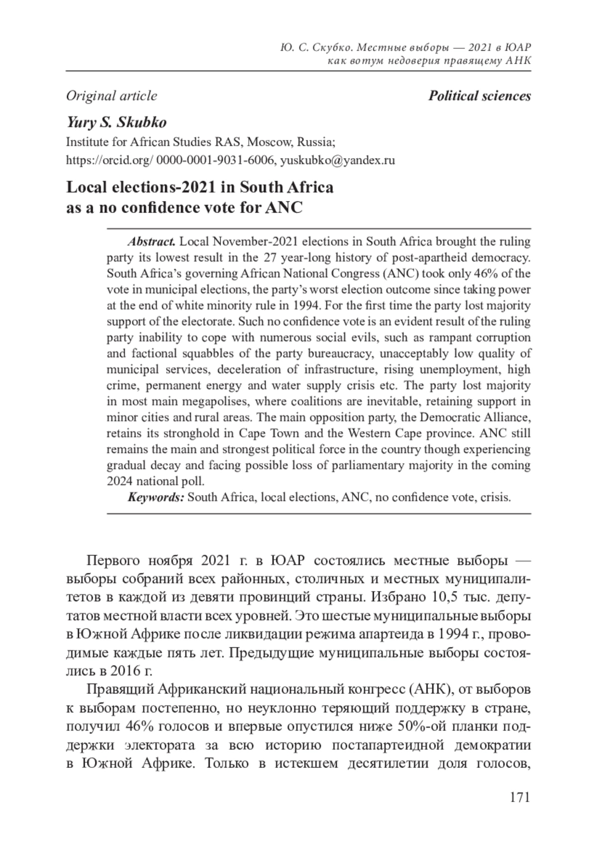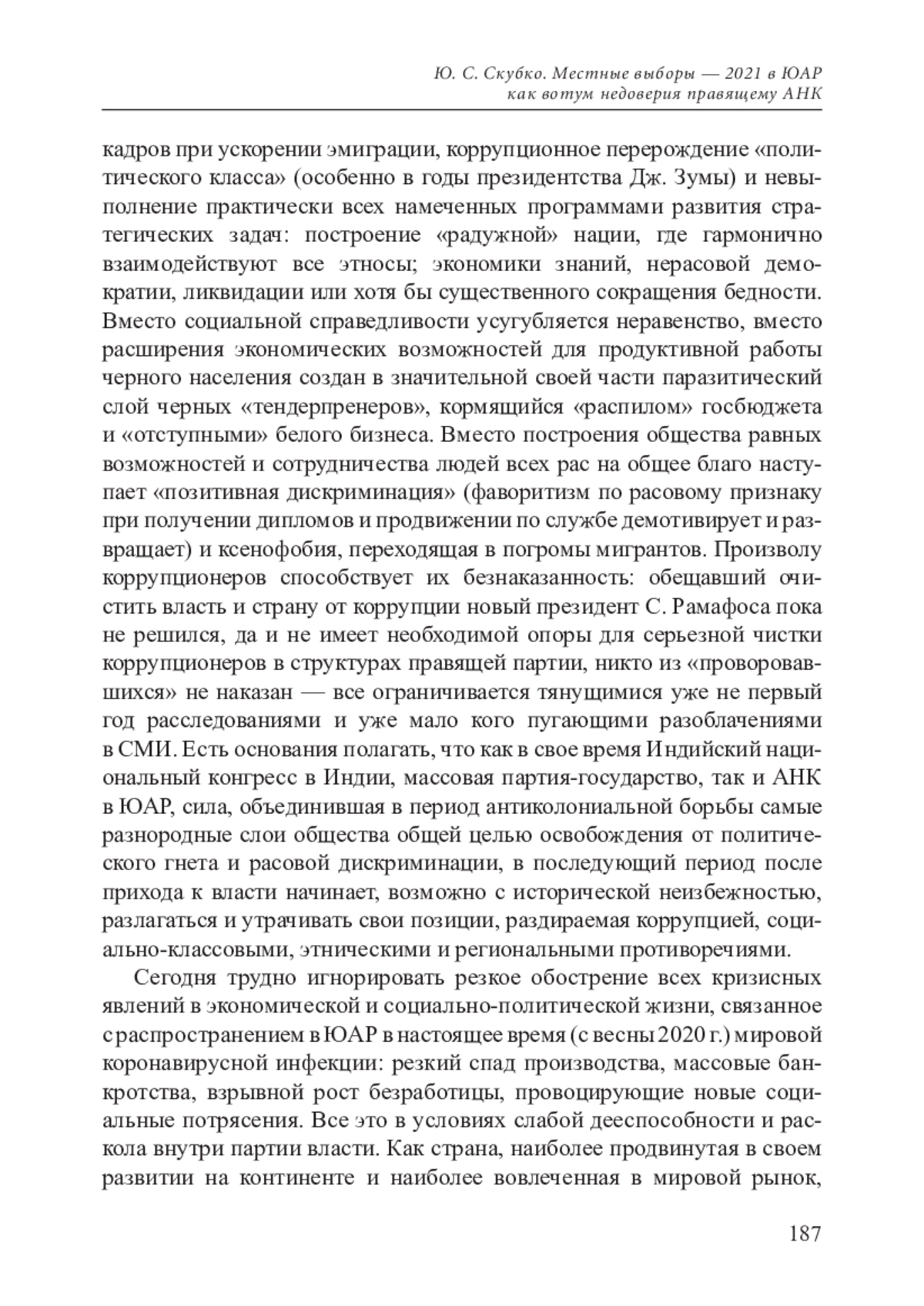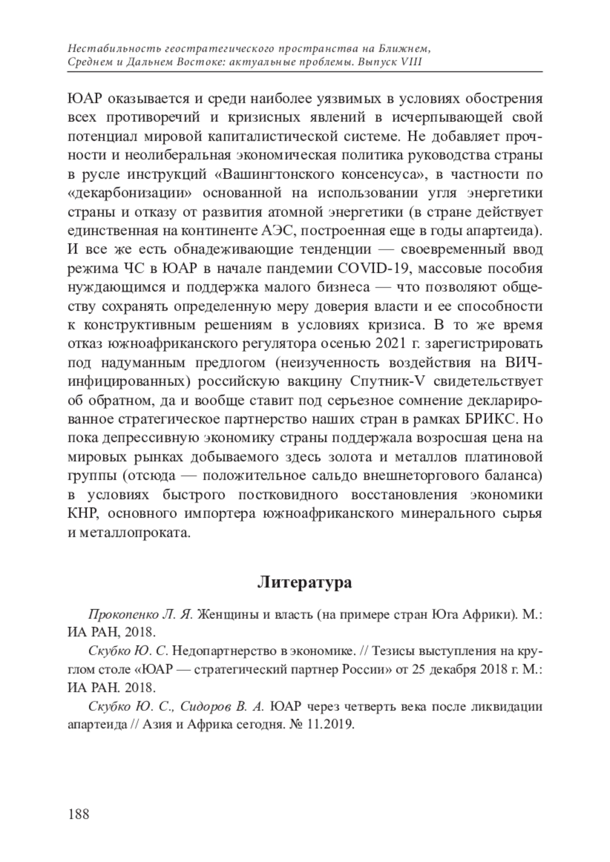 3. Скубко Ю. С., Сидоров В. А. ЮАР через четверть века после ликвидации апартеида // Азия и Африка сегодня. № 11.2019.