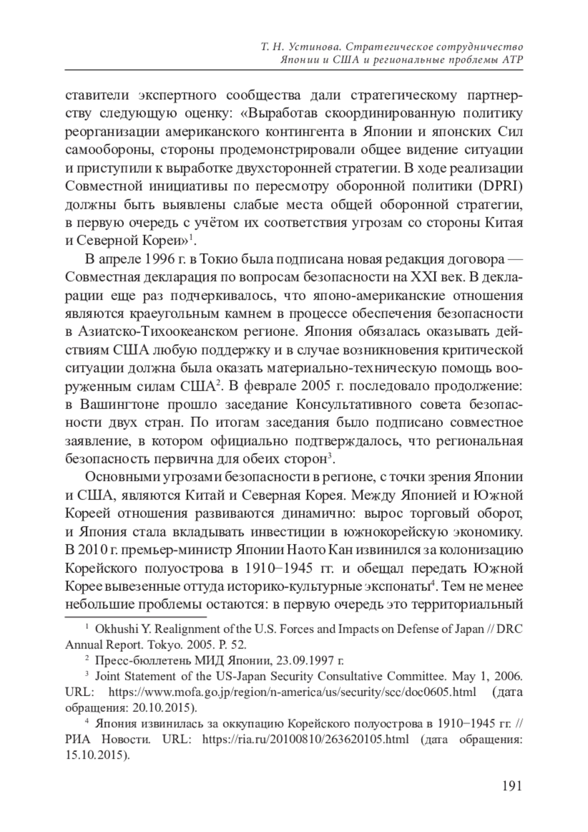 3. Okhushi Y. Realignment of the U.S. Forces and Impacts on Defense of Japan // DRC Annual Repor’t. Tokyo. 2005.
