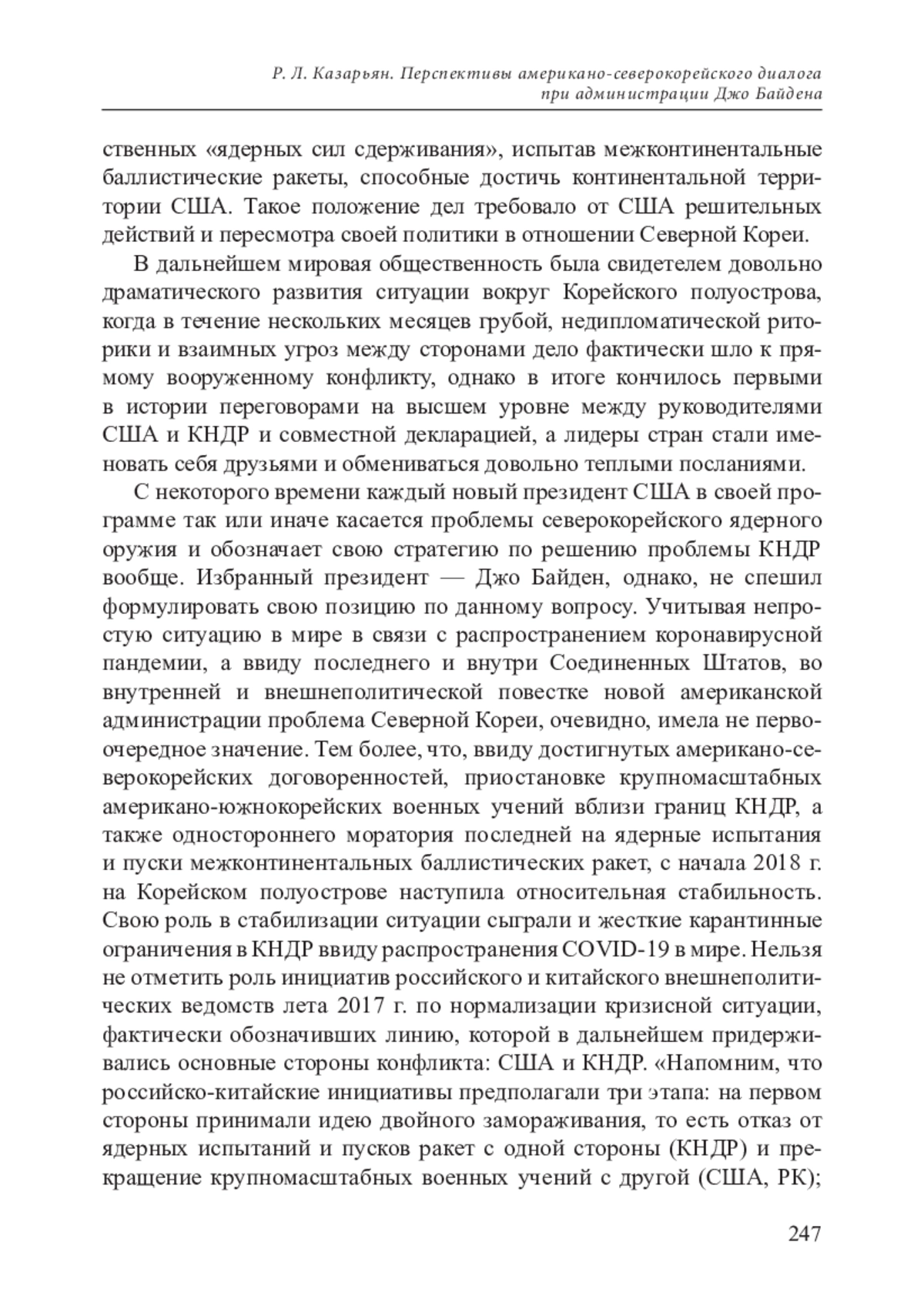 3. Казарьян Р. Л. В поисках продолжения диалога: о развитии американо-северокорейских отношений и общей ситуации на Корейском полуострове в 2019 году // Нестабильность геостратегического пространства на Ближнем, Среднем и Дальнем Востоке: актуальные проблемы. Ежегодник 2020 / отв. ред. М. И. Крупянко; Институт востоковедения РАН. М.: ИВ РАН; 2020.