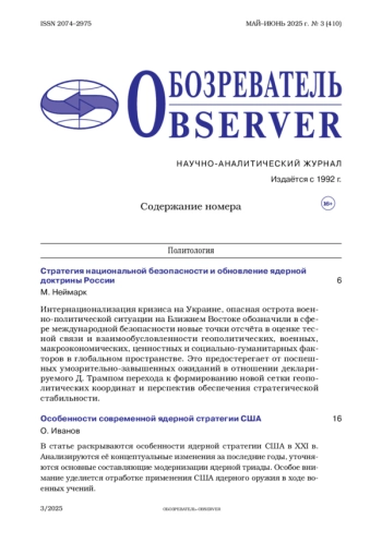 ИВАНОВ О. П. ОСОБЕННОСТИ СОВРЕМЕННОЙ ЯДЕРНОЙ СТРАТЕГИИ США // ОБОЗРЕВАТЕЛЬ. 2025. № 3