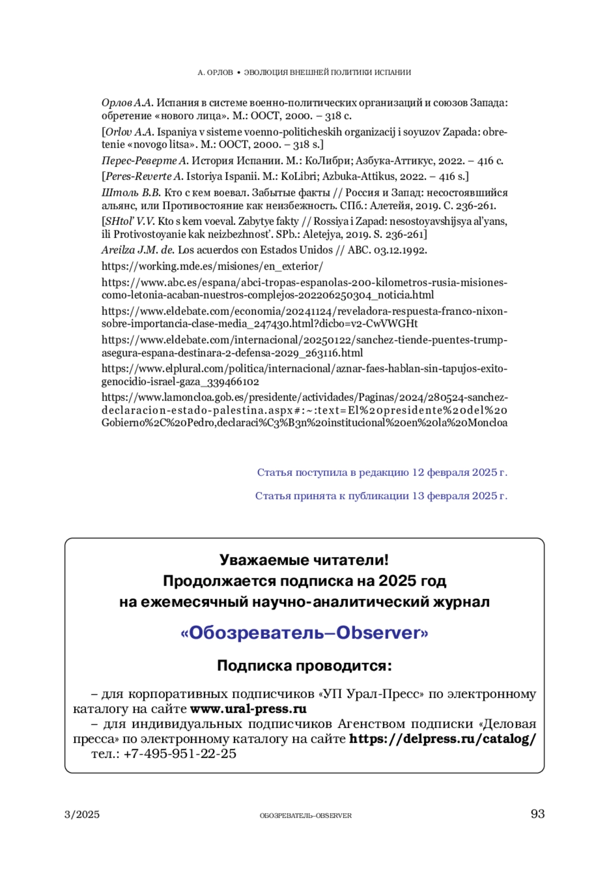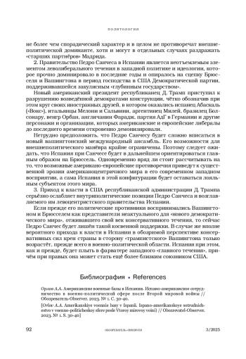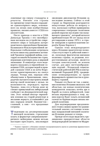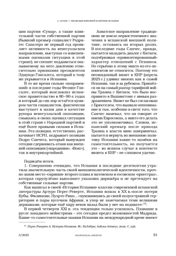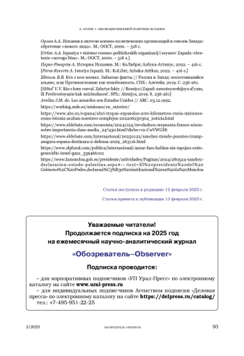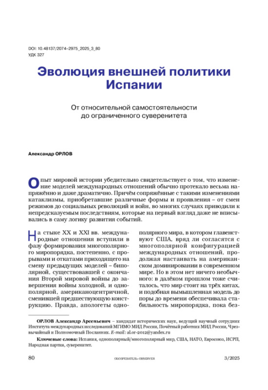 ОРЛОВ А. А. ЭВОЛЮЦИЯ ВНЕШНЕЙ ПОЛИТИКИ ИСПАНИИ ОТ ОТНОСИТЕЛЬНОЙ САМОСТОЯТЕЛЬНОСТИ ДО ОГРАНИЧЕННОГО СУВЕРЕНИТЕТА // ОБОЗРЕВАТЕЛЬ. 2025. № 3