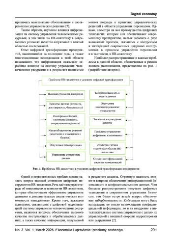 Целью данной научной статьи является исследование влияния цифровизации на систему управления человеческими ресурсами, в частности на HR-аналитику, а также выявление ключевых проблем, возникающих при цифровой трансформации HR-процессов, анализ возможных решений для эффективной интеграции цифровых инструментов в кадровый менеджмент современных организаций. В ходе исследования были выполнены следующие задачи. Проанализировано влияние цифровизации на систему управления человеческими ресурсами, включая HR-аналитику. Выявлены ключевые проблемы, возникающие при внедрении цифровых инструментов в HR-аналитику и кадровый менеджмент. Рассмотрены вопросы интеграции HR-аналитики с другими бизнес-системами (финансовыми, операционными, управленческими). Проанализированы проблемы масштабируемости HR-аналитики, её адаптации к изменениям бизнес-стратегий. Исследованы вопросы обеспечения информационной безопасности и конфиденциальности данных при цифровизации HR-процессов. Проведена оценка необходимости повышения квалификации HR-специалистов для эффективной работы с цифровыми инструментами. Изучены культурные и этические аспекты HR-аналитики, связанные с мониторингом сотрудников. Рассмотрены проблемы отсутствия единых стандартов HR-аналитики, усложняющие сравнение показателей между компаниями. Выявлены проблем коммуникации между подразделениями при внедрении HR-аналитики. Определено стратегическое значение цифровизации HR-аналитики для достижения бизнес-результатов.