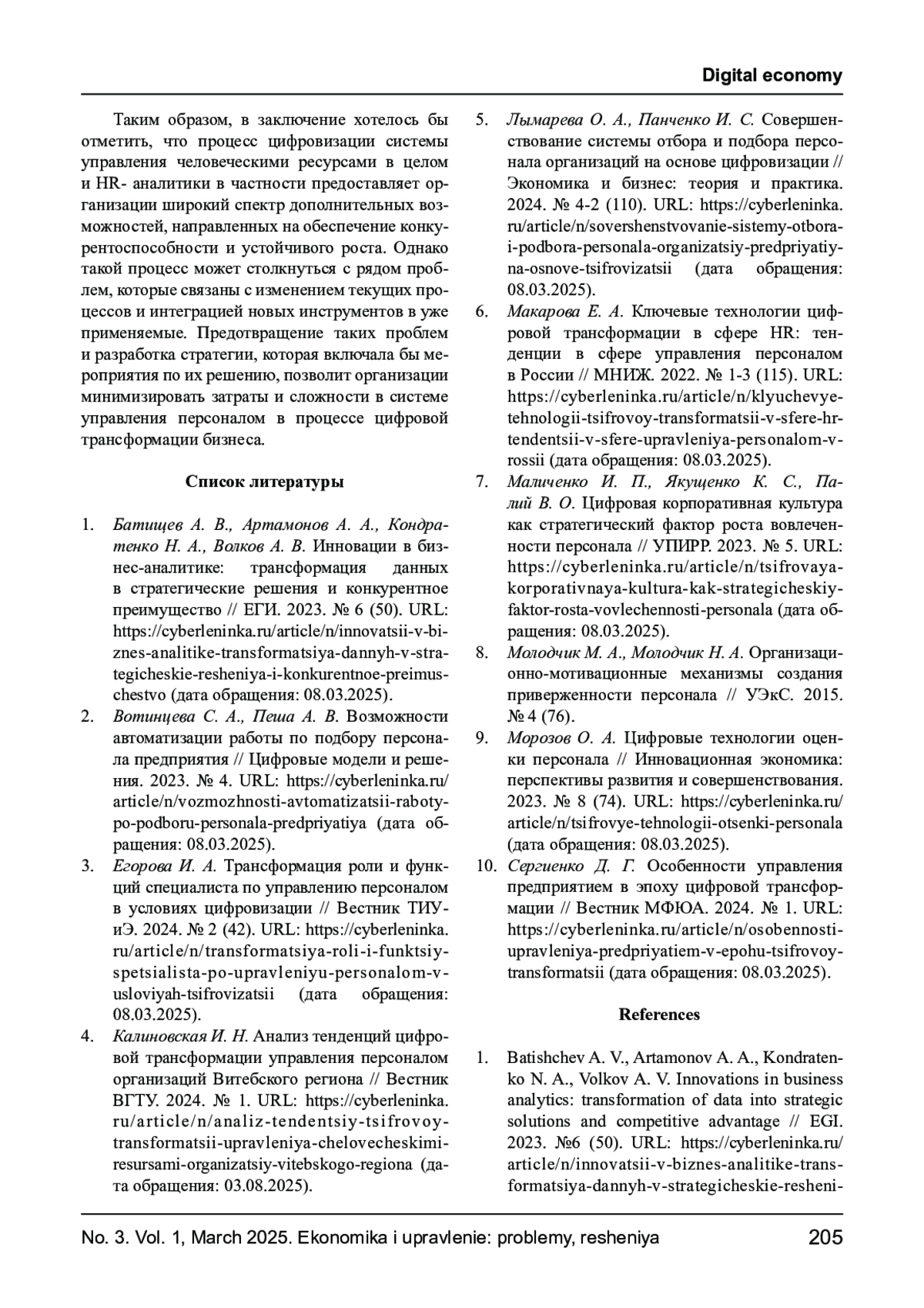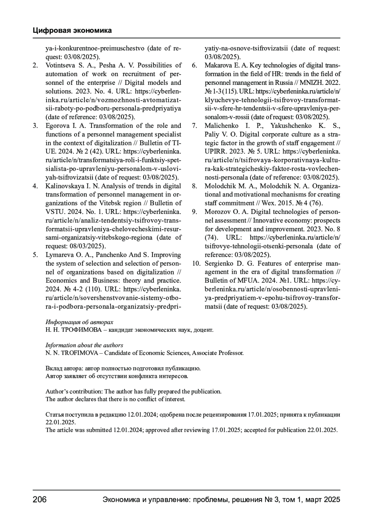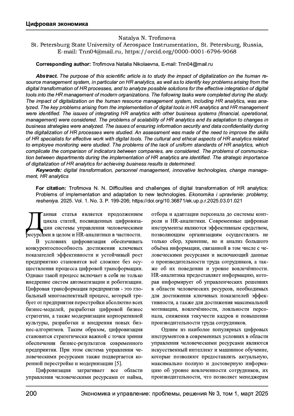 ТРОФИМОВА Н. Н. ТРУДНОСТИ И ВЫЗОВЫ ЦИФРОВОЙ ТРАНСФОРМАЦИИ HR-АНАЛИТИКИ: ПРОБЛЕМЫ ВНЕДРЕНИЯ И АДАПТАЦИИ К НОВЫМ ТЕХНОЛОГИЯМ // ЭКОНОМИКА И УПРАВЛЕНИЕ: ПРОБЛЕМЫ, РЕШЕНИЯ. 2025. ТОМ 1 № 3