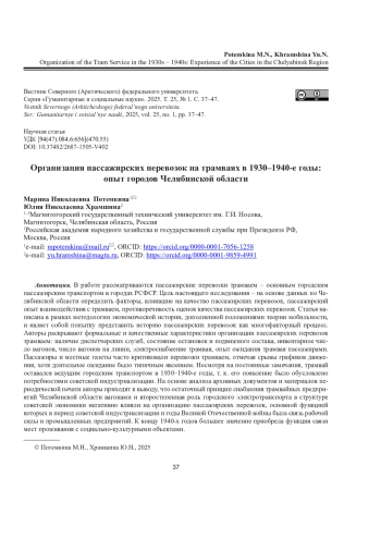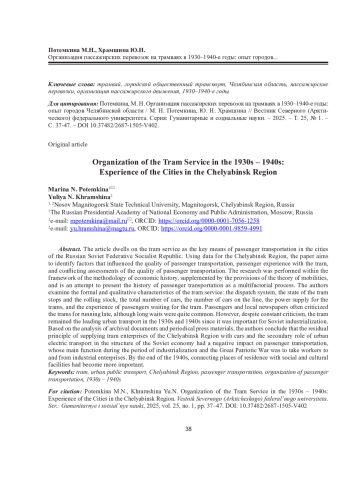 В работе рассматриваются пассажирские перевозки трамваем - основным городским пассажирским транспортом в городах РСФСР. Цель настоящего исследования - на основе данных по Челябинской области определить факторы, влиявшие на качество пассажирских перевозок, пассажирский опыт взаимодействия с трамваем, противоречивость оценок качества пассажирских перевозок. Статья написана в рамках методологии экономической истории, дополненной положениями теории мобильности, и являет собой попытку представить историю пассажирских перевозок как многофакторный процесс. Авторы раскрывают формальные и качественные характеристики организации пассажирских перевозок трамваем: наличие диспетчерских служб, состояние остановок и подвижного состава, инвентарное число вагонов, число вагонов на линии, электроснабжение трамвая, опыт ожидания трамвая пассажирами. Пассажиры и местные газеты часто критиковали перевозки трамваем, отмечая срывы графиков движения, хотя длительное ожидание было типичным явлением. Несмотря на постоянные замечания, трамвай оставался ведущим городским транспортом в 1930-1940-е годы, т. к. его появление было обусловлено потребностями советской индустриализации. На основе анализа архивных документов и материалов периодической печати авторы приходят к выводу, что остаточный принцип снабжения трамвайных предприятий Челябинской области вагонами и второстепенная роль городского электротранспорта в структуре советской экономики негативно влияли на организацию пассажирских перевозок, основной функцией которых в период советской индустриализации и годы Великой Отечественной войны была связь рабочей силы и промышленных предприятий. К концу 1940-х годов большее значение приобрела функция связи мест проживания с социально-культурными объектами