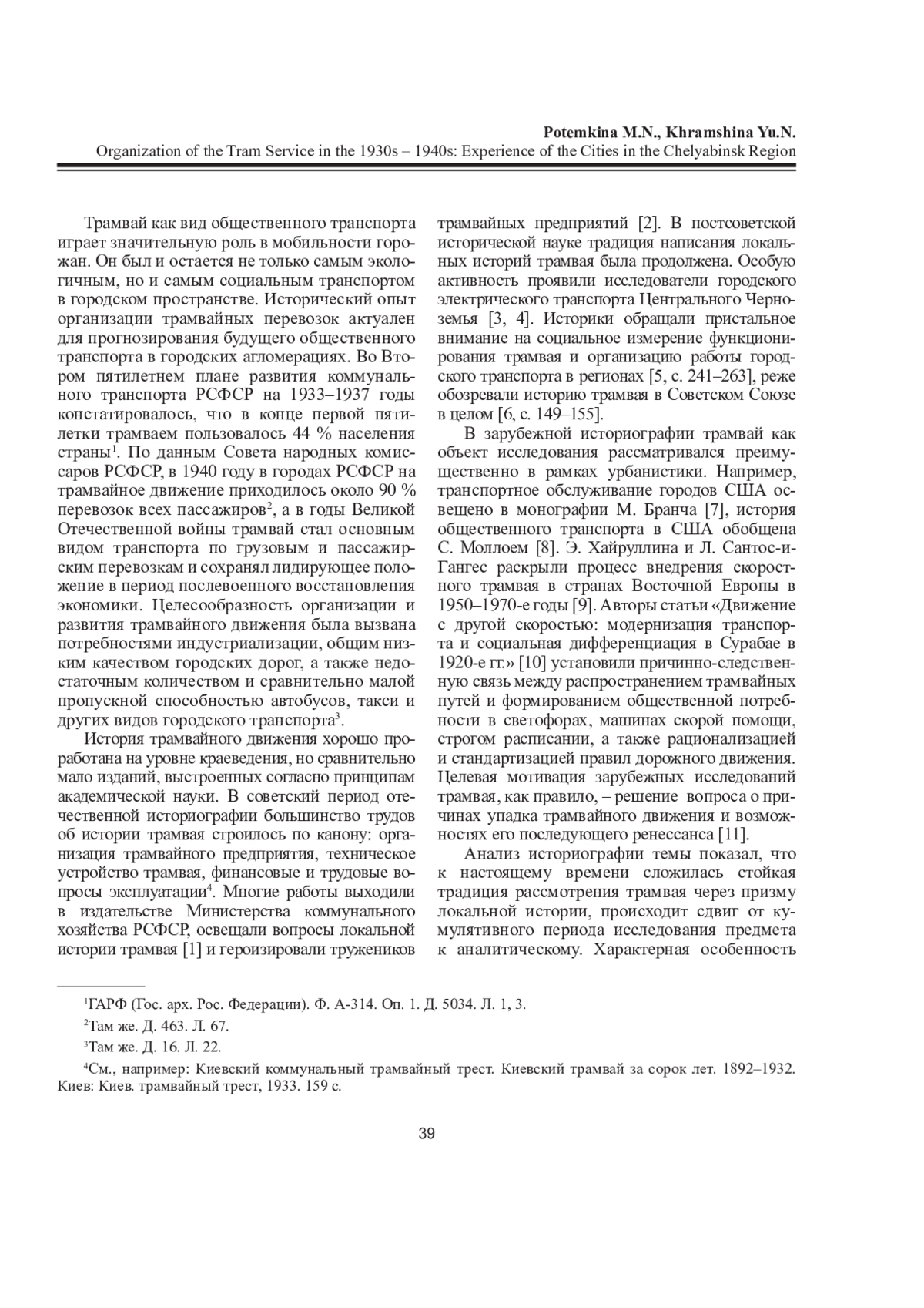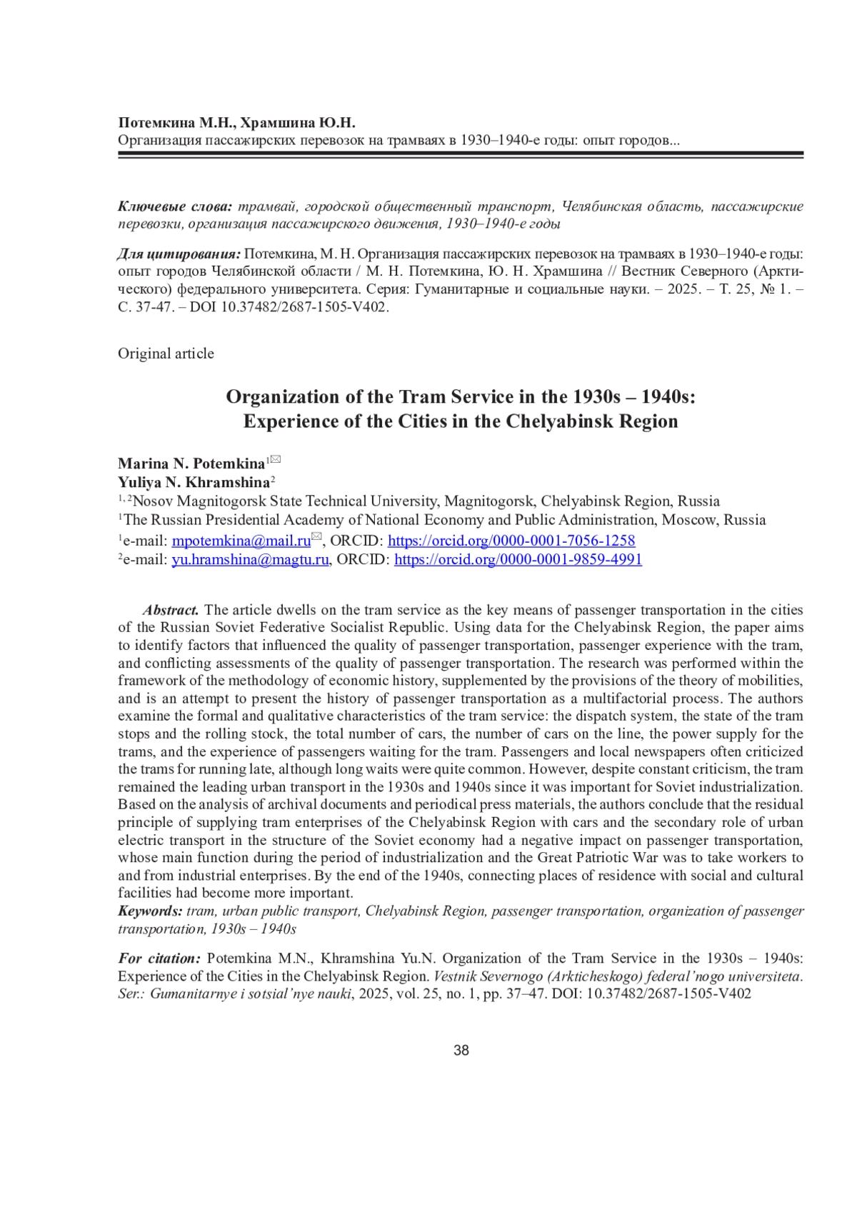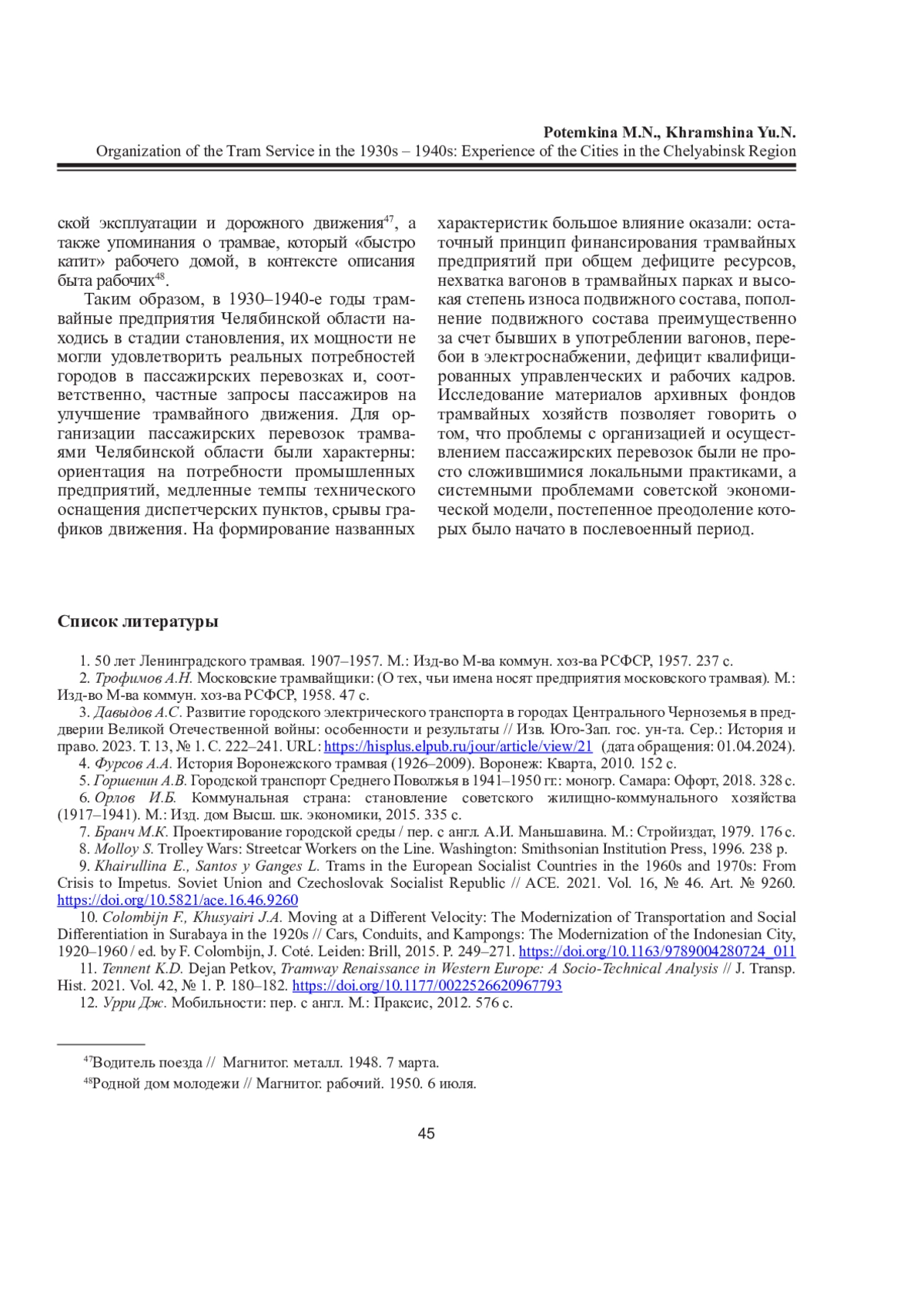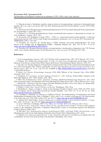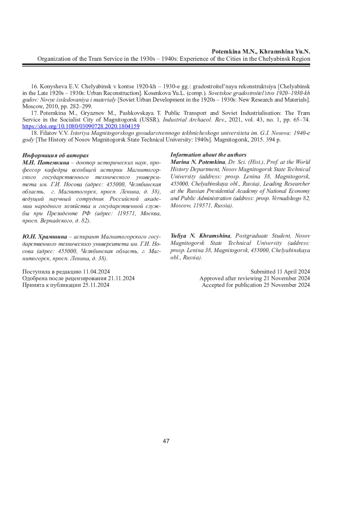 17. Potemkina M., Gryaznov M., Pashkovskaya T. Public Transport and Soviet Industrialisation: The Tram Service in the Socialist City of Magnitogorsk (USSR) // Industrial Archaeol. Rev. 2021. Vol. 43, No 1. P. 65-74. DOI: 10.1080/03090728.2020.1804159