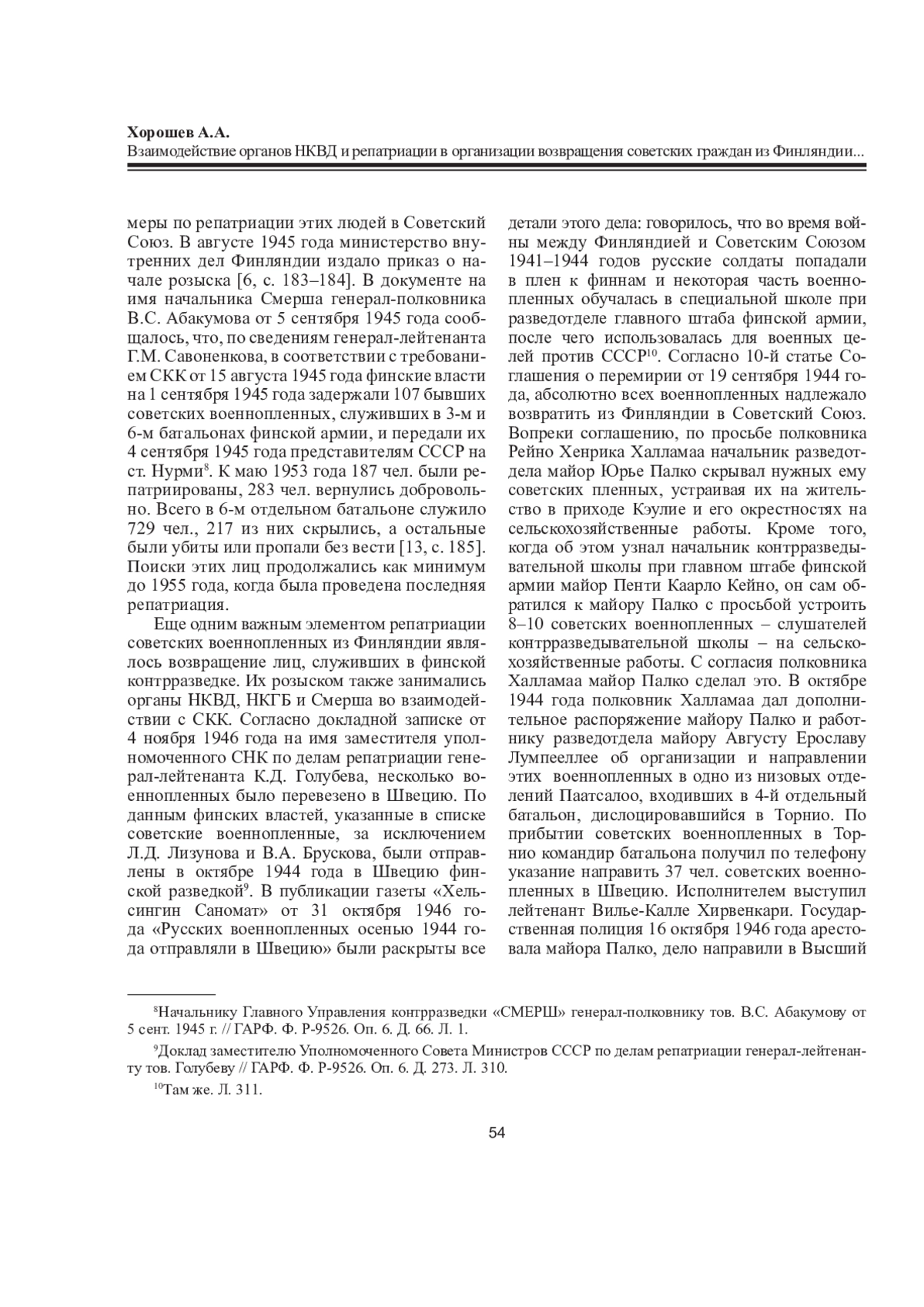 В статье на основе архивных документов, бóльшая часть которых вводится в научный оборот впервые, исследуется деятельность созданного в октябре 1944 года Управления уполномоченного Совета народных комиссаров СССР по делам репатриации советских граждан, объединившего ведомства, имевшие собственные зоны ответственности и вступавшие друг с другом в противоречия: Народный комиссариат внутренних дел, Народный комиссариат государственной безопасности и Главное управление контрразведки «Смерш» Народного комиссариата обороны. Материалы, касающиеся организации репатриации из Финляндии в СССР с 1944 по 1955 год, позволяют раскрыть процессы оперативного межведомственного взаимодействия, разработки соответствующих инструкций, ведомственного согласования в непредвиденных ситуациях. В конечном счете объединенные действия названных структур обеспечили успешную репатриацию не менее чем 100 тыс. советских граждан и военнопленных. В работе выделены аспекты, повлиявшие на ход репатриации, включая создание нормативно-правовой базы для разграничения межведомственных полномочий, выявление преступных элементов среди репатриантов, поиск сбежавших пленных. Постановления Государственного комитета обороны, нормативные документы Народного комиссариата внутренних дел, принятые и утвержденные в военное и послевоенное время, легли в основу процесса репатриации советских граждан, в т. ч. из Финляндии. В ходе исследования установлено, что часть советских граждан принимала участие в боевых действиях на стороне Финляндии в составе 3-го и 6-го батальонов. Некоторые военнопленные занимались контрразведывательной деятельностью, сотрудничали с администрацией лагерей. В статье обосновывается вывод, согласно которому межведомственное взаимодействие способствовало созданию устойчивой системы проверки репатриантов, обеспечению безопасности советских военнопленных и интернированных в период репатриации, распределению репатриантов для решения экономических задач советского государства.