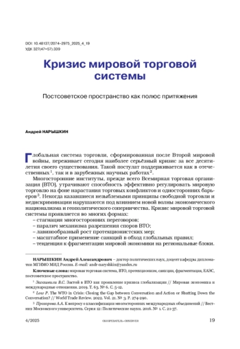 В статье рассматривается современный кризис глобальной торго вой системы и роль постсоветского пространства как альтернатив ного полюса политико-экономического притяжения. Анализируются причины кризиса, включая блокировку механизмов ВТО, усиление протекционизма и фрагментации мировой экономики.