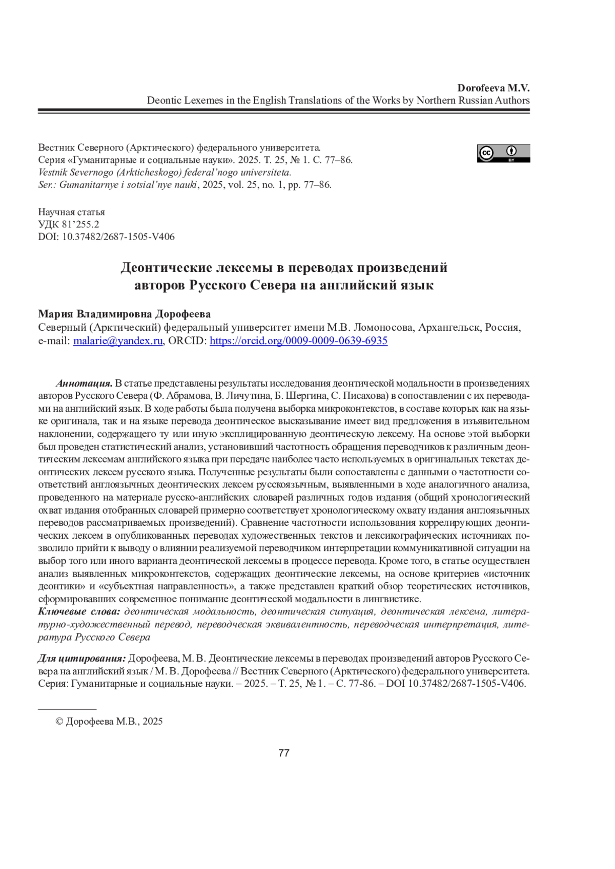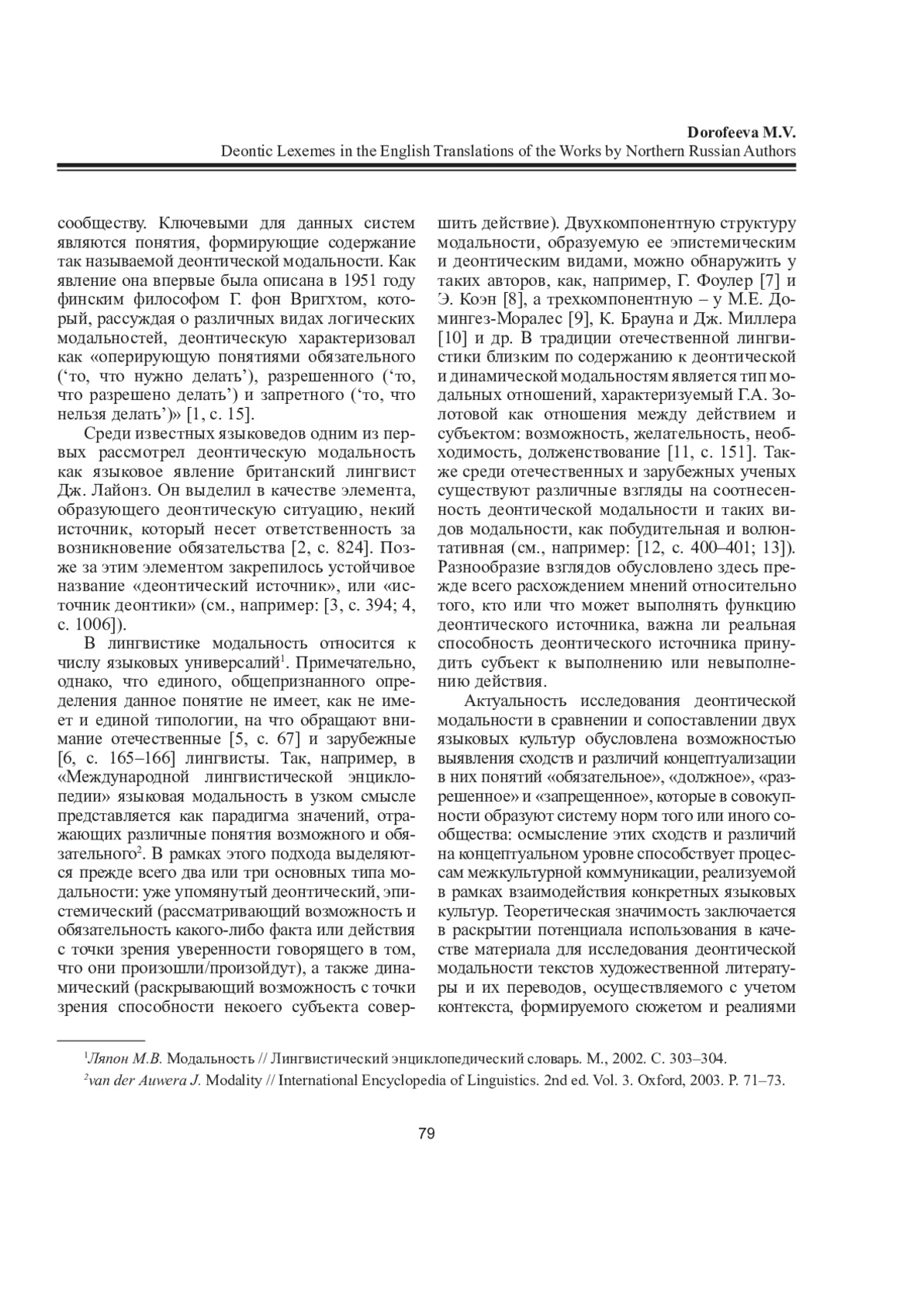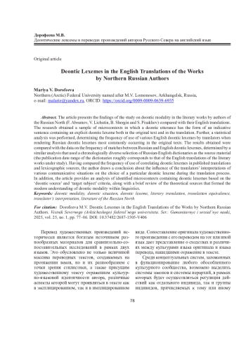В статье представлены результаты исследования деонтической модальности в произведениях авторов Русского Севера (Ф. Абрамова, В. Личутина, Б. Шергина, С. Писахова) в сопоставлении с их переводами на английский язык. В ходе работы была получена выборка микроконтекстов, в составе которых как на языке оригинала, так и на языке перевода деонтическое высказывание имеет вид предложения в изъявительном наклонении, содержащего ту или иную эксплицированную деонтическую лексему. На основе этой выборки был проведен статистический анализ, установивший частотность обращения переводчиков к различным деонтическим лексемам английского языка при передаче наиболее часто используемых в оригинальных текстах деонтических лексем русского языка. Полученные результаты были сопоставлены с данными о частотности соответствий англоязычных деонтических лексем русскоязычным, выявленными в ходе аналогичного анализа, проведенного на материале русско-английских словарей различных годов издания (общий хронологический охват издания отобранных словарей примерно соответствует хронологическому охвату издания англоязычных переводов рассматриваемых произведений). Сравнение частотности использования коррелирующих деонтических лексем в опубликованных переводах художественных текстов и лексикографических источниках позволило прийти к выводу о влиянии реализуемой переводчиком интерпретации коммуникативной ситуации на выбор того или иного варианта деонтической лексемы в процессе перевода. Кроме того, в статье осуществлен анализ выявленных микроконтекстов, содержащих деонтические лексемы, на основе критериев «источник деонтики» и «субъектная направленность», а также представлен краткий обзор теоретических источников, сформировавших современное понимание деонтической модальности в лингвистике.