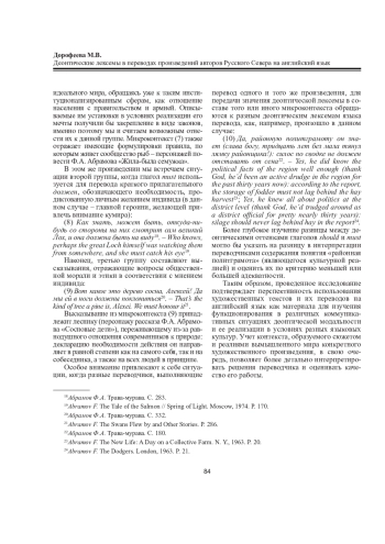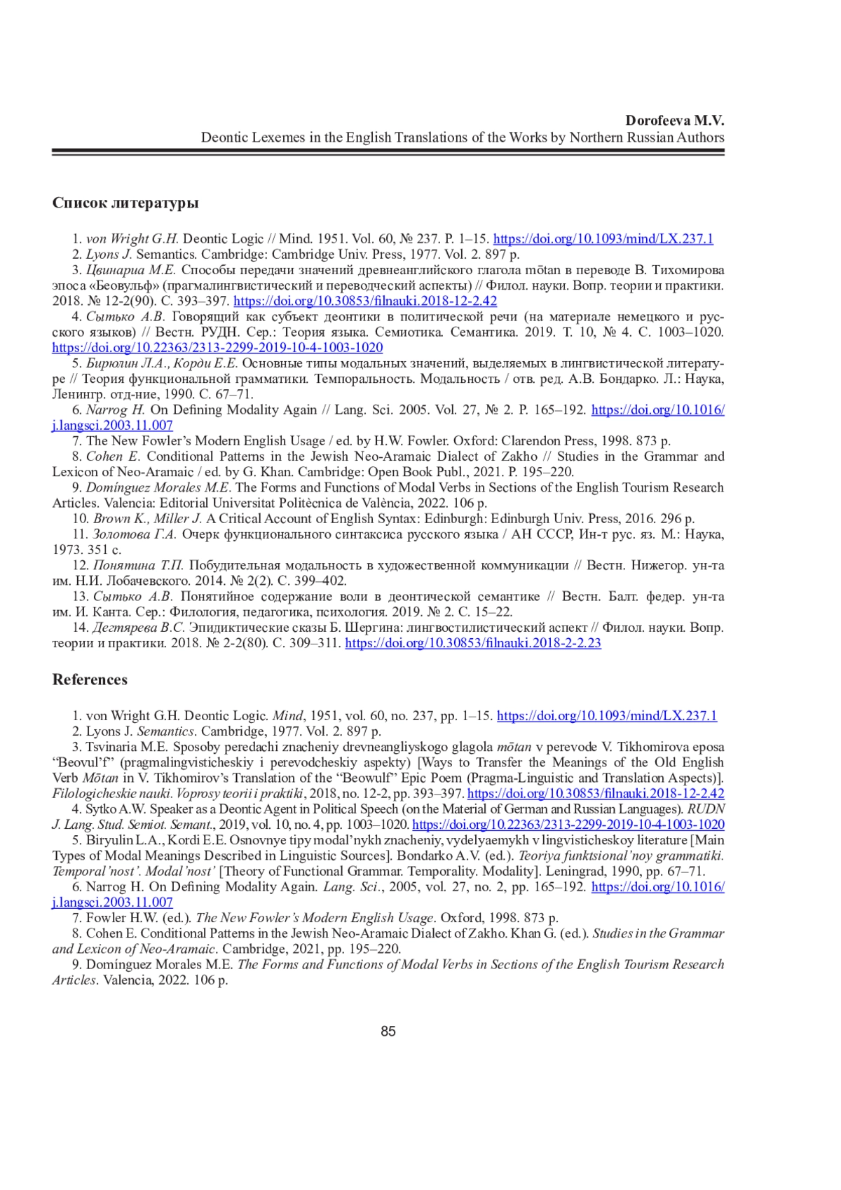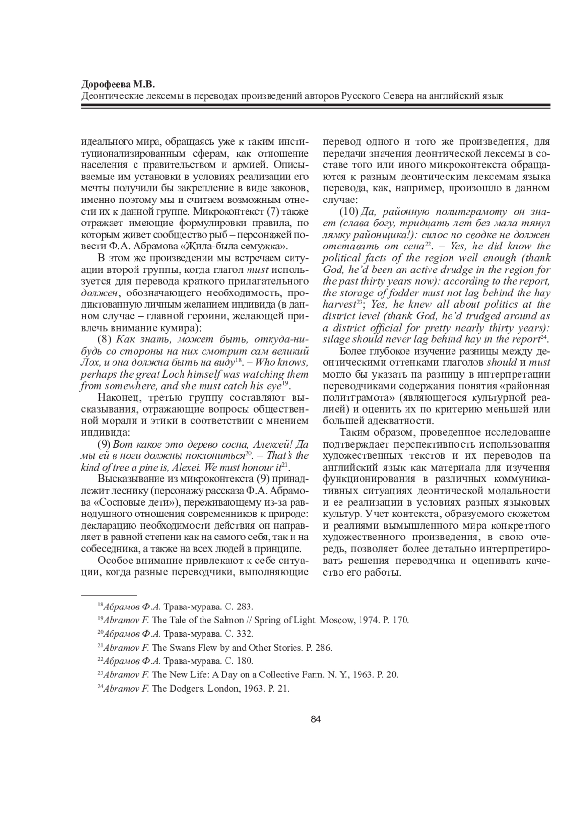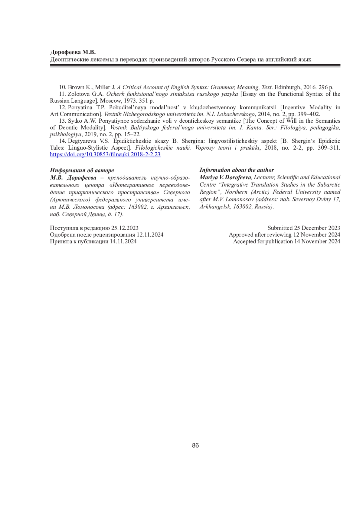 В статье представлены результаты исследования деонтической модальности в произведениях авторов Русского Севера (Ф. Абрамова, В. Личутина, Б. Шергина, С. Писахова) в сопоставлении с их переводами на английский язык. В ходе работы была получена выборка микроконтекстов, в составе которых как на языке оригинала, так и на языке перевода деонтическое высказывание имеет вид предложения в изъявительном наклонении, содержащего ту или иную эксплицированную деонтическую лексему. На основе этой выборки был проведен статистический анализ, установивший частотность обращения переводчиков к различным деонтическим лексемам английского языка при передаче наиболее часто используемых в оригинальных текстах деонтических лексем русского языка. Полученные результаты были сопоставлены с данными о частотности соответствий англоязычных деонтических лексем русскоязычным, выявленными в ходе аналогичного анализа, проведенного на материале русско-английских словарей различных годов издания (общий хронологический охват издания отобранных словарей примерно соответствует хронологическому охвату издания англоязычных переводов рассматриваемых произведений). Сравнение частотности использования коррелирующих деонтических лексем в опубликованных переводах художественных текстов и лексикографических источниках позволило прийти к выводу о влиянии реализуемой переводчиком интерпретации коммуникативной ситуации на выбор того или иного варианта деонтической лексемы в процессе перевода. Кроме того, в статье осуществлен анализ выявленных микроконтекстов, содержащих деонтические лексемы, на основе критериев «источник деонтики» и «субъектная направленность», а также представлен краткий обзор теоретических источников, сформировавших современное понимание деонтической модальности в лингвистике.