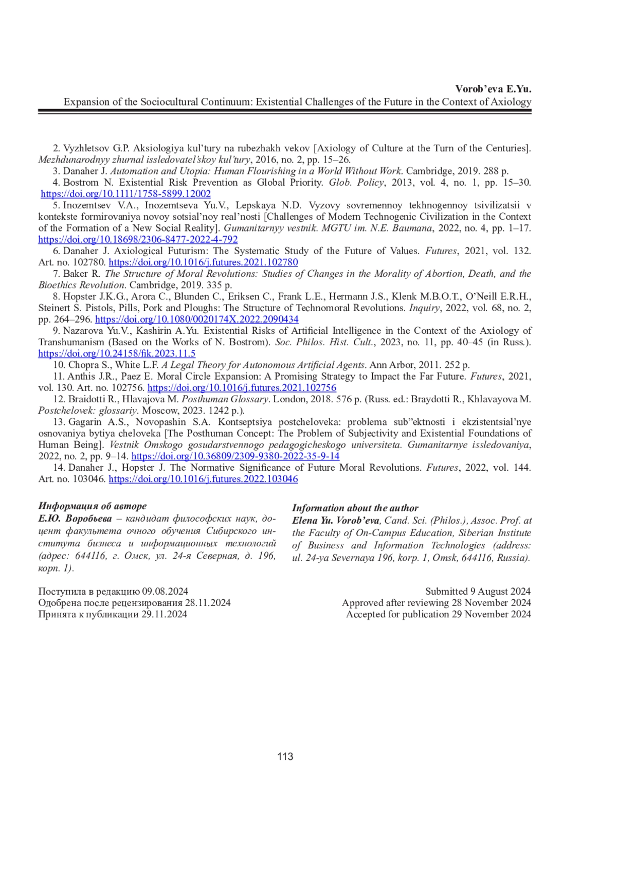 5. Иноземцев В.А., Иноземцева Ю.В., Лепская Н.Д. Вызовы современной техногенной цивилизации в контексте формирования новой социальной реальности // Гуманит. вестн. МГТУ им. Н.Э. Баумана. 2022. No 4 (96). С. 1-17. DOI: 10.18698/2306-8477-2022-4-792