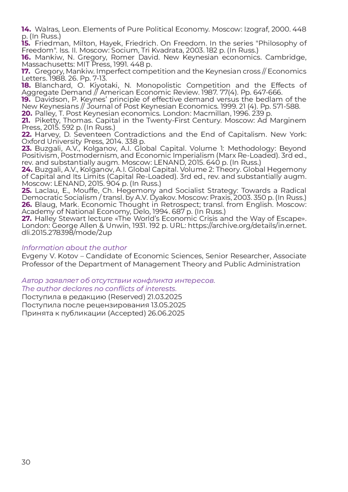 19. Davidson, P. Keynes’ principle of effective demand versus the bedlam of the New Keynesians // Journal of Post Keynesian Economics. 1999. 21 (4). Рр. 571-588.