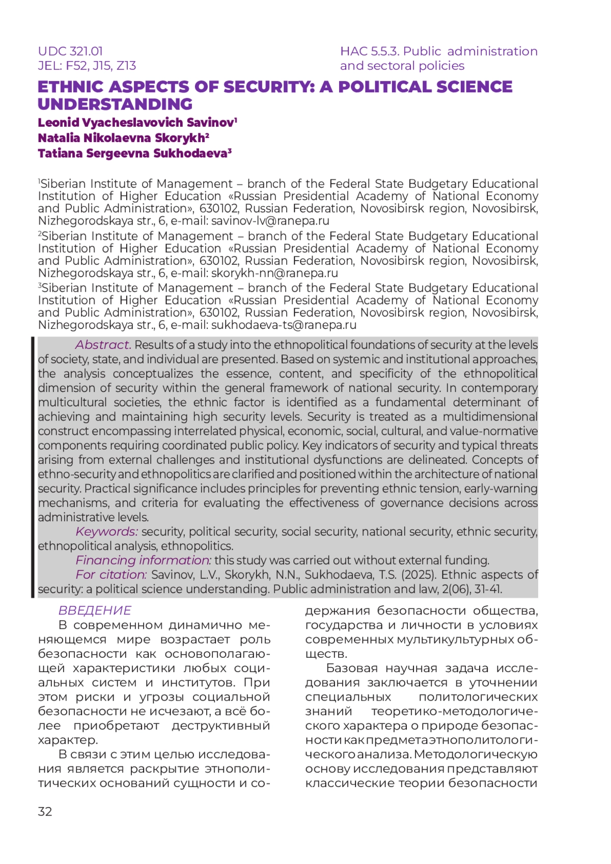 В работе представлены результаты исследования этнополитических оснований безопасности общества, государства и личности. На основе системного и институционального подходов предпринята попытка осмысления сущности, содержания и специфики этнополитического измерения безопасности в рамках общей концепции национальной безопасности. Обоснован вывод о том, что в современных мультикультурных обществах этнический фактор является базовым в достижении и удержании высокого уровня безопасности. Показано, что безопасность включает взаимосвязанные физический, экономический, социальный, культурный и ценностно-нормативный компоненты, требующие согласованной политики. Выявлены ключевые индикаторы состояния безопасности и типовые угрозы, порождаемые как внешними вызовами, так и дисфункциями институтов. Уточнены понятия этнобезопасности и этнополитики, их место в архитектуре национальной безопасности. Практическая значимость исследования состоит в формулировании принципов профилактики этнической напряжённости, механизмов раннего предупреждения конфликтов и критериев оценки эффективности управленческих решений на различных уровнях управления.