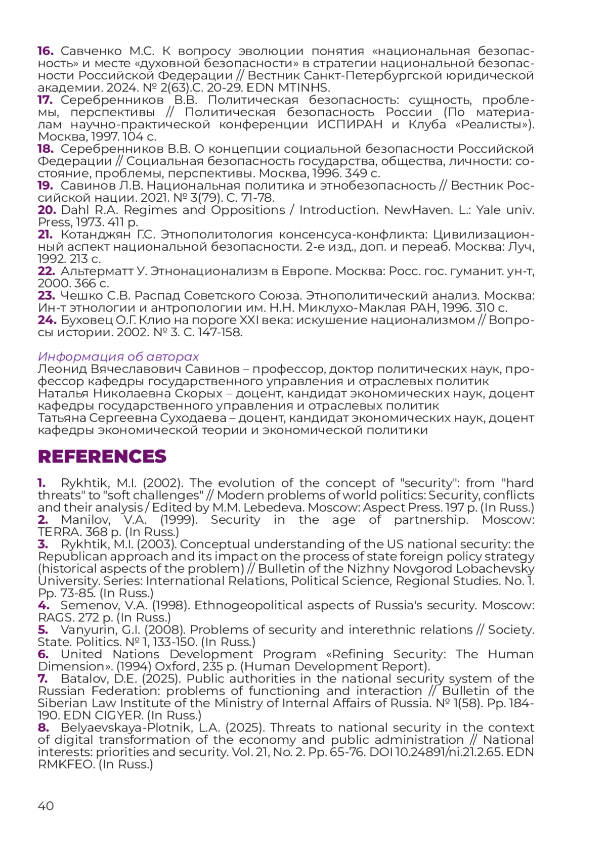 19. Савинов Л.В. Национальная политика и этнобезопасность // Вестник Российской нации. 2021. № 3(79). С. 71-78.