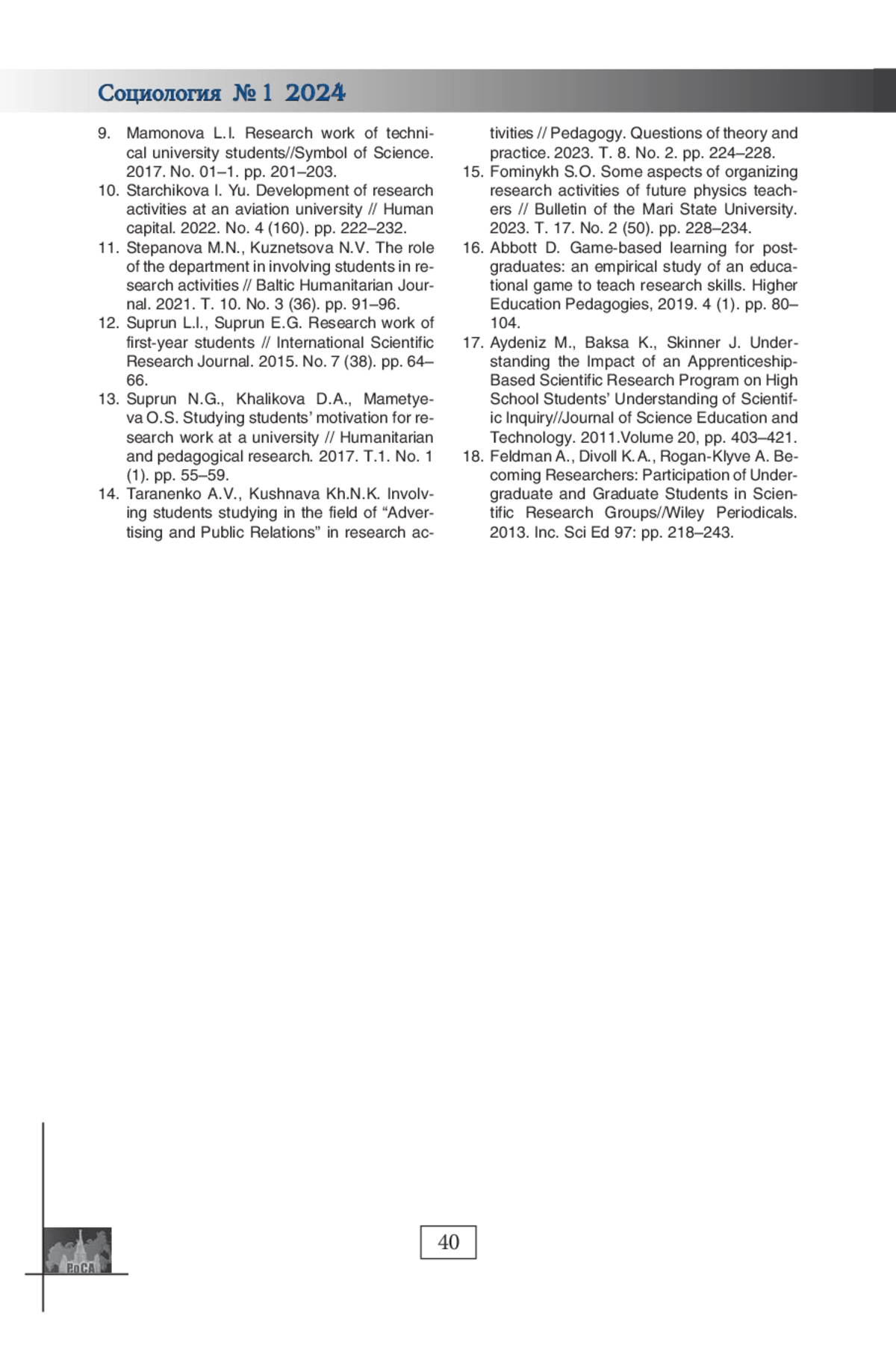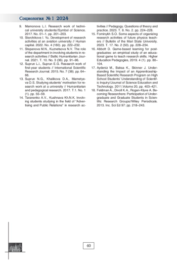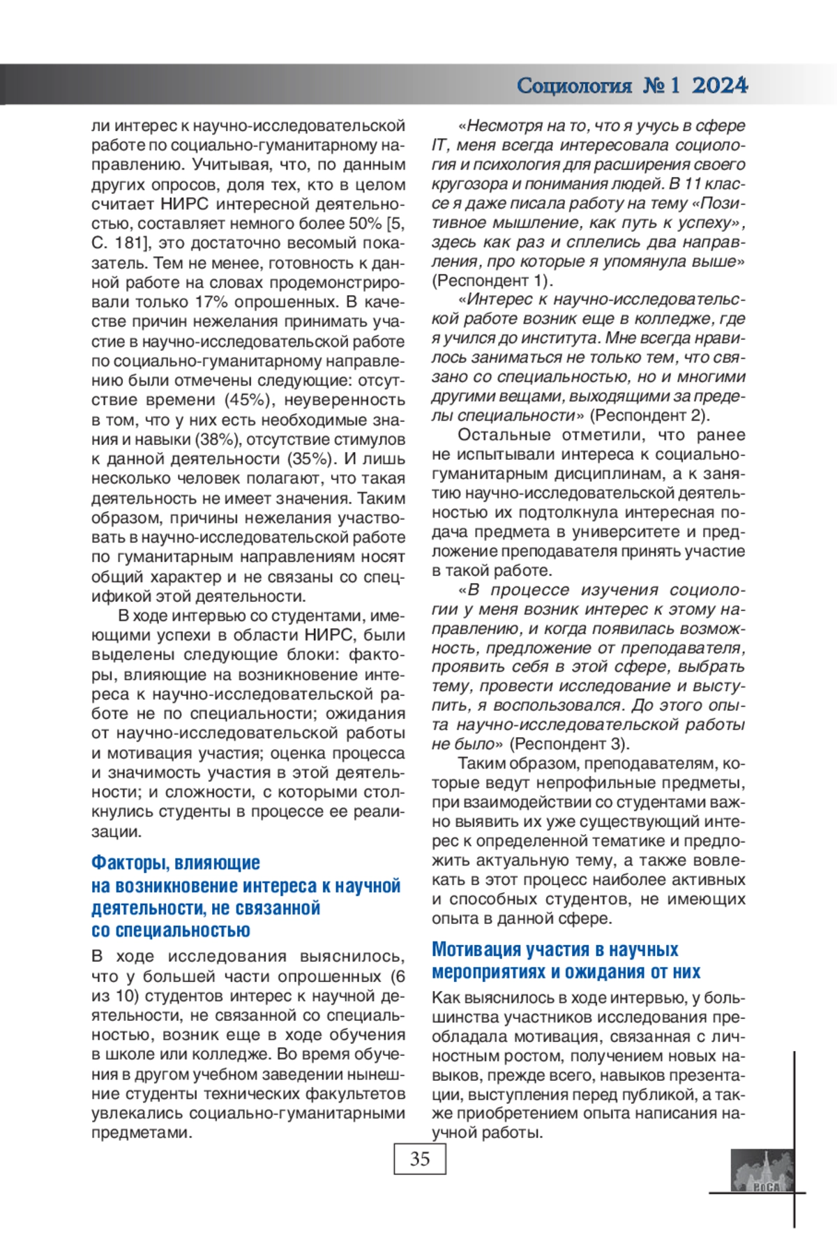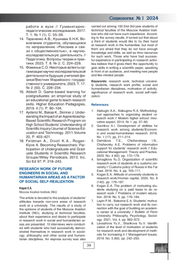 КОГАН Е. А. НАУЧНО-ИССЛЕДОВАТЕЛЬСКАЯ РАБОТА БУДУЩИХ ИНЖЕНЕРОВ ПО СОЦИАЛЬНО-ГУМАНИТАРНЫМ НАПРАВЛЕНИЯМ КАК ФАКТОР СОЦИАЛЬНОЙ САМОРЕАЛИЗАЦИИ // СОЦИОЛОГИЯ. 2024. № 1