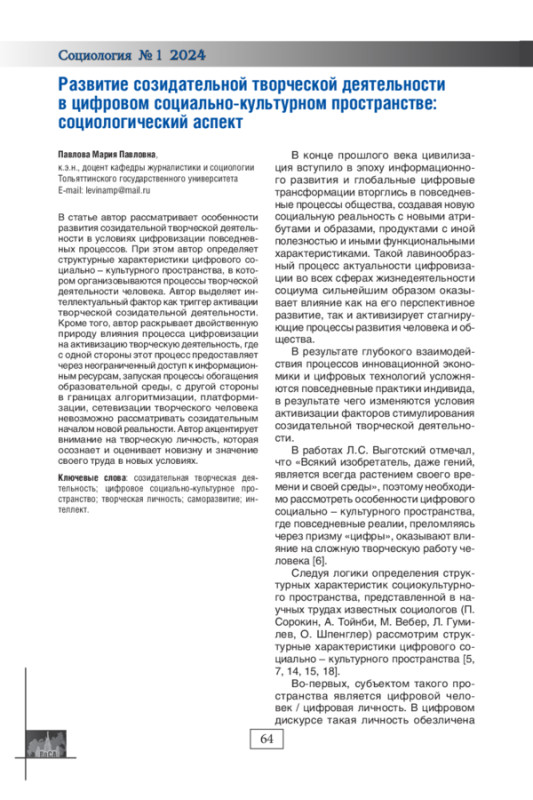 В статье автор рассматривает особенности развития созидательной творческой деятельности в условиях цифровизации повседневных процессов. При этом автор определяет структурные характеристики цифрового социально - культурного пространства, в котором организовываются процессы творческой деятельности человека. Автор выделяет интеллектуальный фактор как триггер активации творческой созидательной деятельности. Кроме того, автор раскрывает двойственную природу влияния процесса цифровизации на активизацию творческую деятельность, где с одной стороны этот процесс предоставляет через неограниченный доступ к информационным ресурсам, запуская процессы обогащения образовательной среды, с другой стороны в границах алгоритмизации, платформизации, сетевизации творческого человека невозможно рассматривать созидательным началом новой реальности. Автор акцентирует внимание на творческую личность, которая осознает и оценивает новизну и значение своего труда в новых условиях.