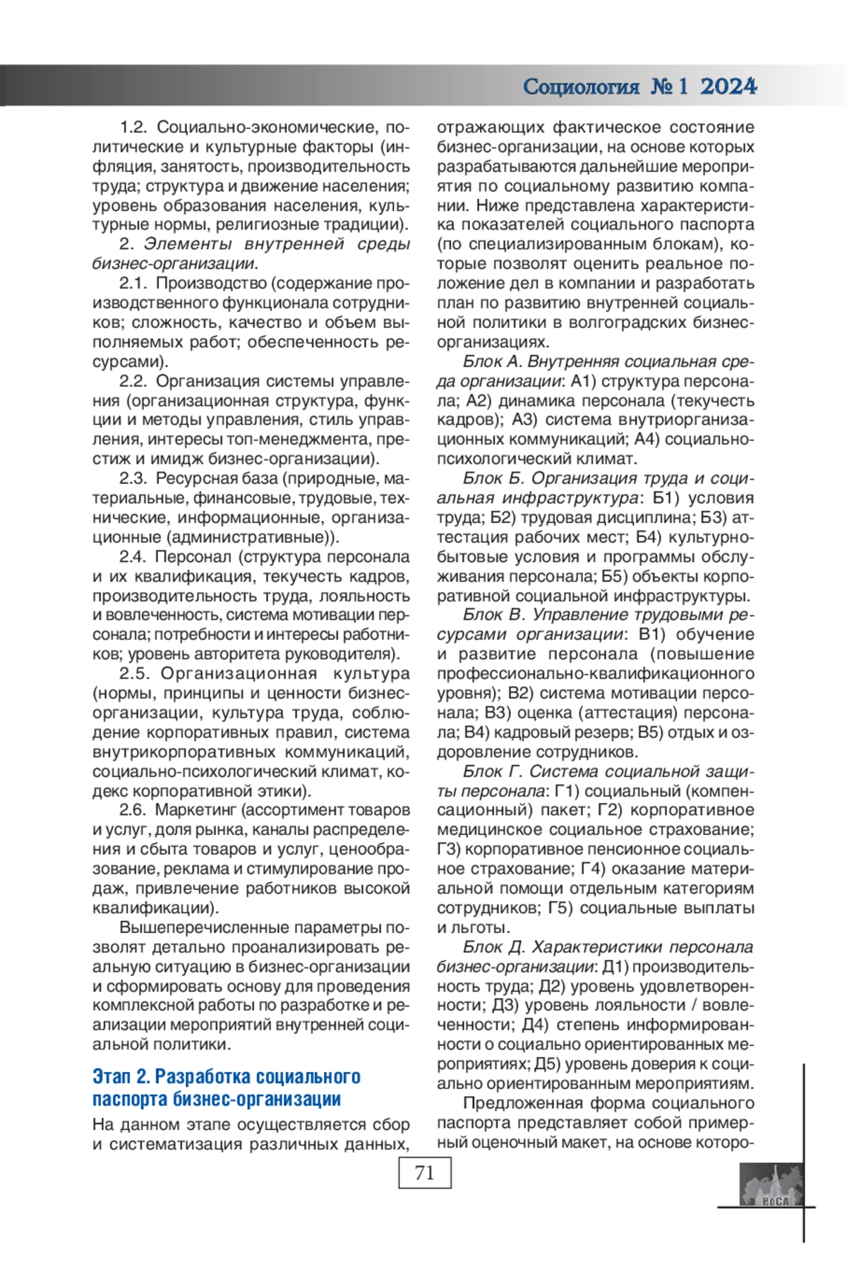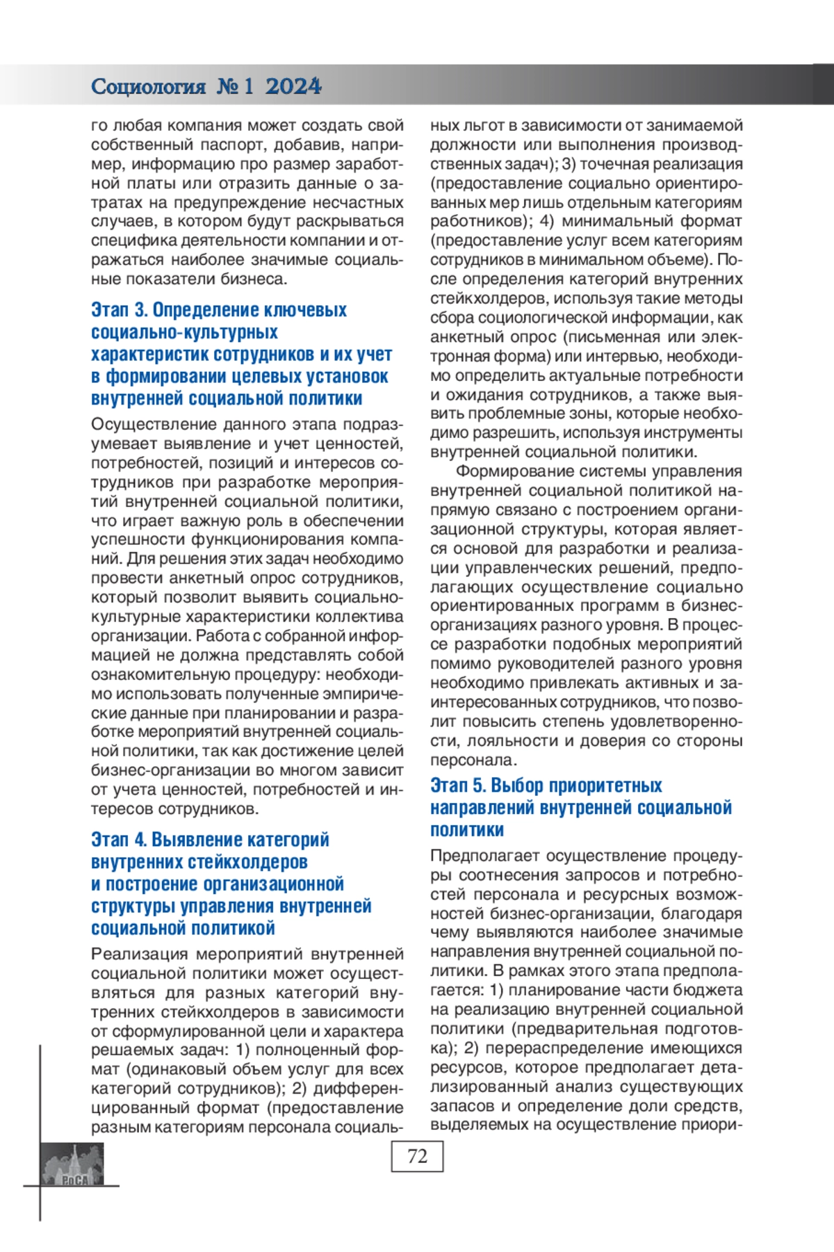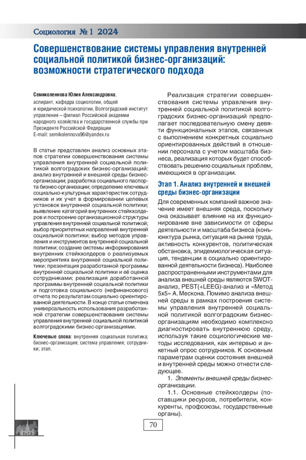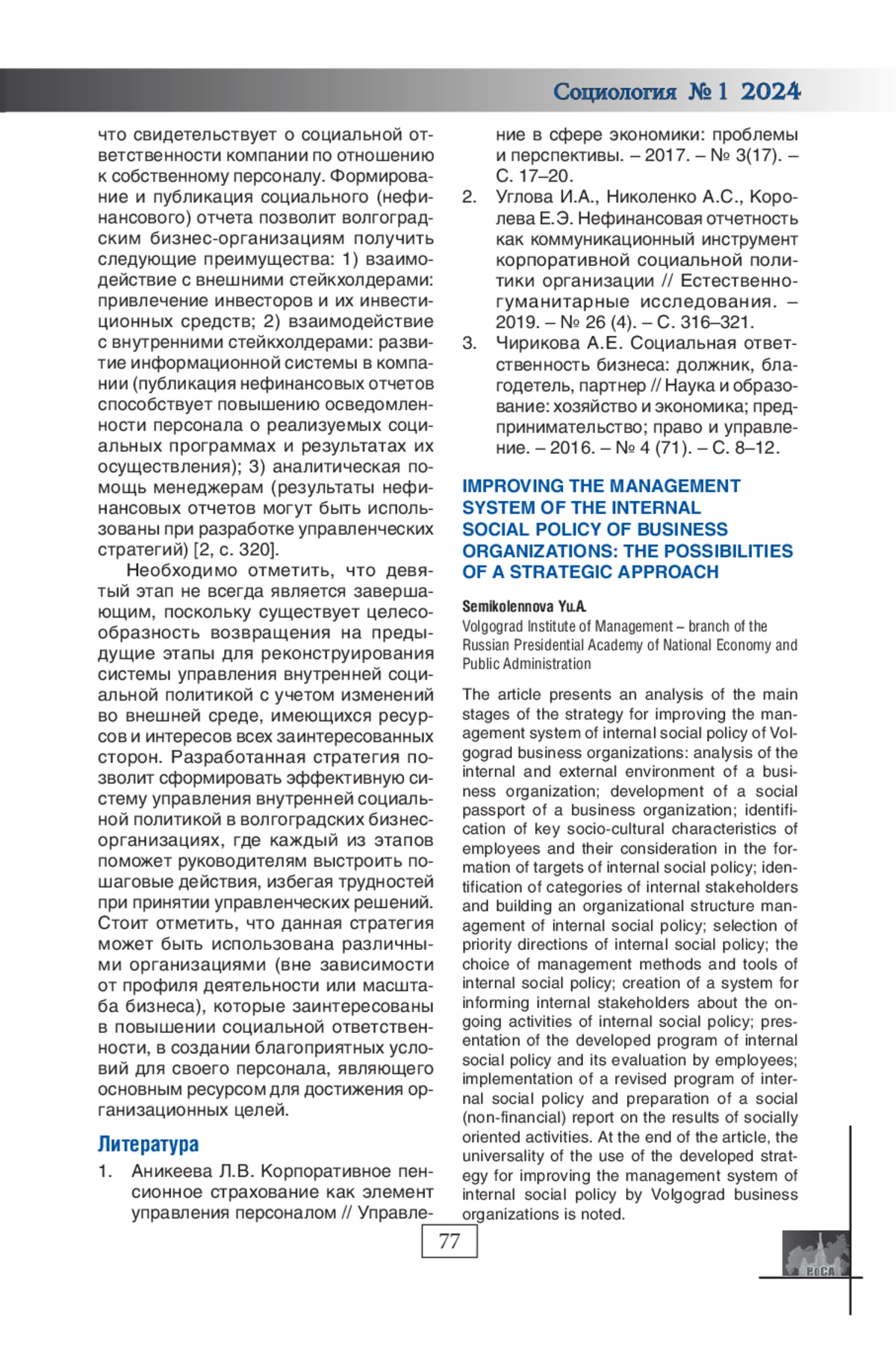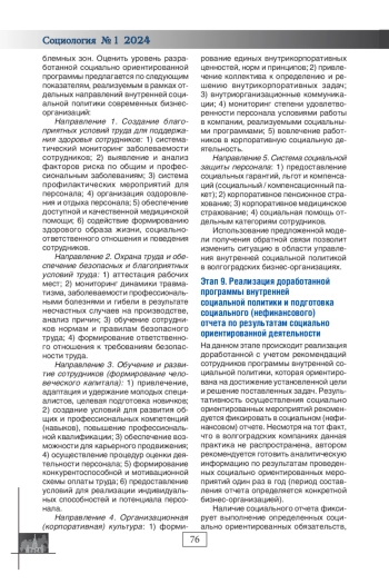 СЕМИКОЛЕННОВА Ю. А. СОВЕРШЕНСТВОВАНИЕ СИСТЕМЫ УПРАВЛЕНИЯ ВНУТРЕННЕЙ СОЦИАЛЬНОЙ ПОЛИТИКОЙ БИЗНЕС-ОРГАНИЗАЦИЙ: ВОЗМОЖНОСТИ СТРАТЕГИЧЕСКОГО ПОДХОДА // СОЦИОЛОГИЯ. 2024. № 1