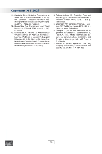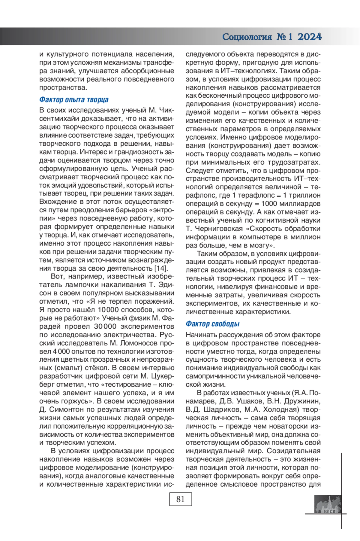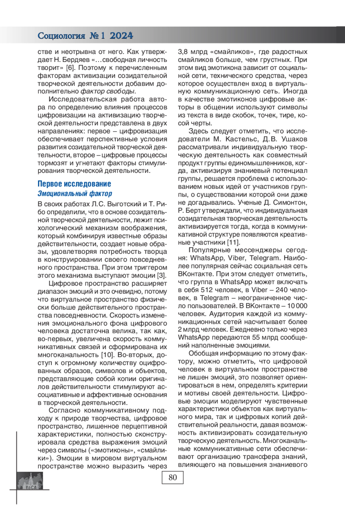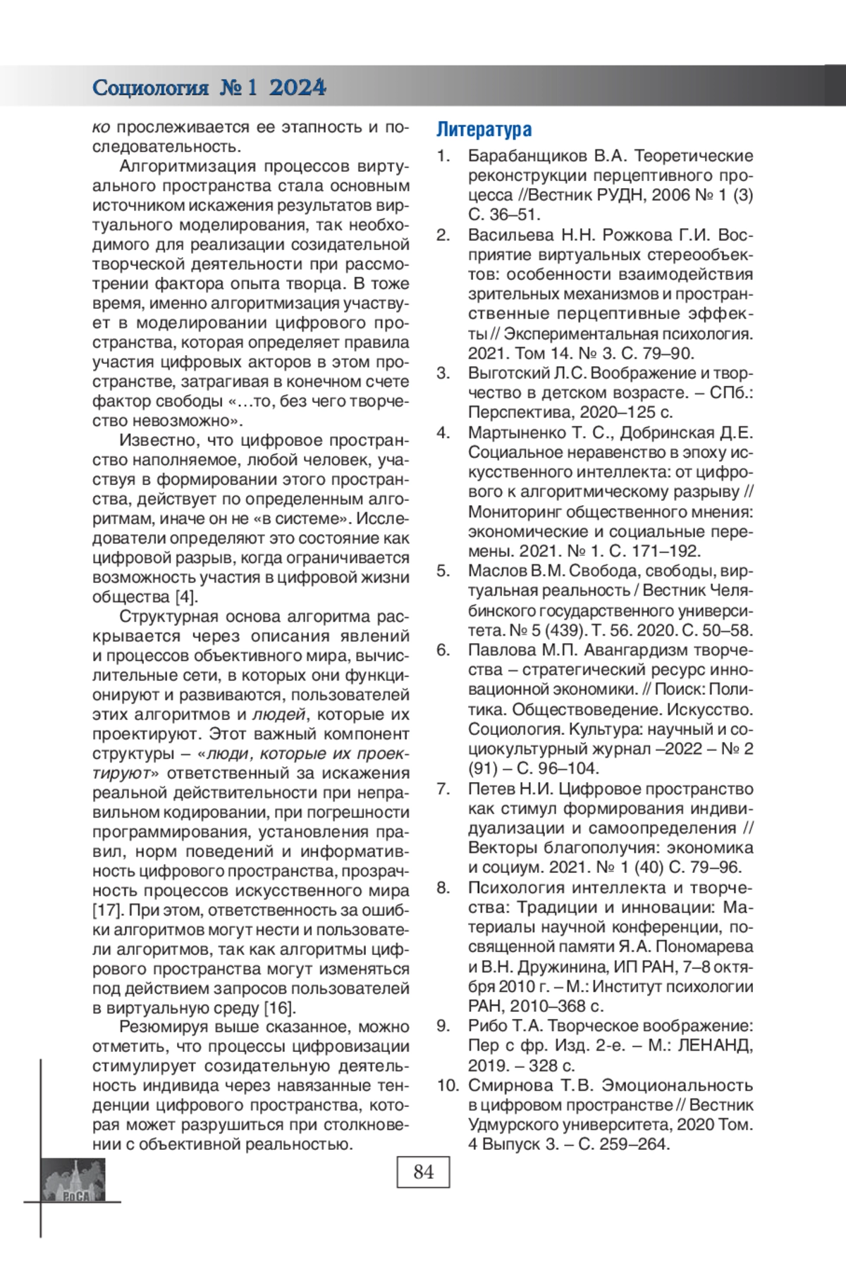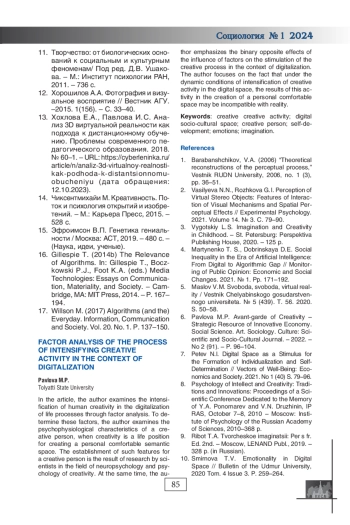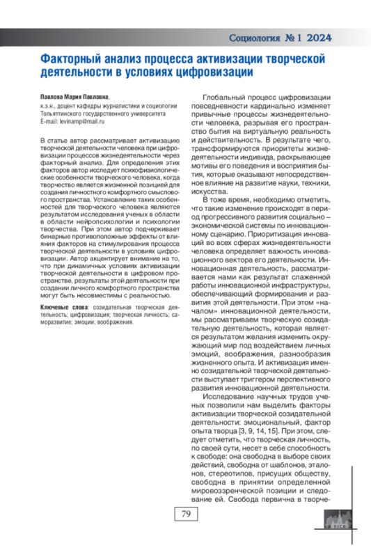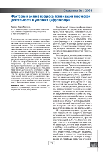 ПАВЛОВА М. П. ФАКТОРНЫЙ АНАЛИЗ ПРОЦЕССА АКТИВИЗАЦИИ ТВОРЧЕСКОЙ ДЕЯТЕЛЬНОСТИ В УСЛОВИЯХ ЦИФРОВИЗАЦИИ // СОЦИОЛОГИЯ. 2024. № 1