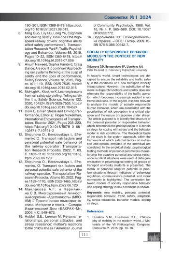 В современном мире надежность и безопасность движения в условиях инфраструктуры транспортной мобильности призваны обеспечить смарт технологии. Однако замещение человека в диспетчерских функциях не устраняют ответственности оператора движения, которая становится все более очевидной в экстремальных ситуациях. В этой связи представляется актуальным анализ моделей социально-ответственного поведения, которые связаны с персональными особенностями восприятия риска и характером реагирования в условиях стресса. Цель статьи - выявление структуры личностного потенциала ответственного поведения, определяющего предрасположенность к определённой стратегии преодоления стресса и модели поведения в ситуации риска. Теоретическим основанием исследования выступает системный подход, в рамках которого соотносятся внешние факторы мотивации и внутренние установки личности. В эмпирическом исследовании использовались методики психологического тестирования личностных параметров, характеризующих потенциал адаптивности и стрессоустойчивости в критических ситуациях. Представлено обобщение статистических данных психологического тестирования групп студентов транспортного вуза. Выделена матрица личностного потенциала адаптации в проблемных ситуациях через показатели поведенческой регуляции, коммуникативного потенциала, моральной нормативности. Показано соотношение моделей социальноответственного поведения и копинг-стратегии в условиях риска.