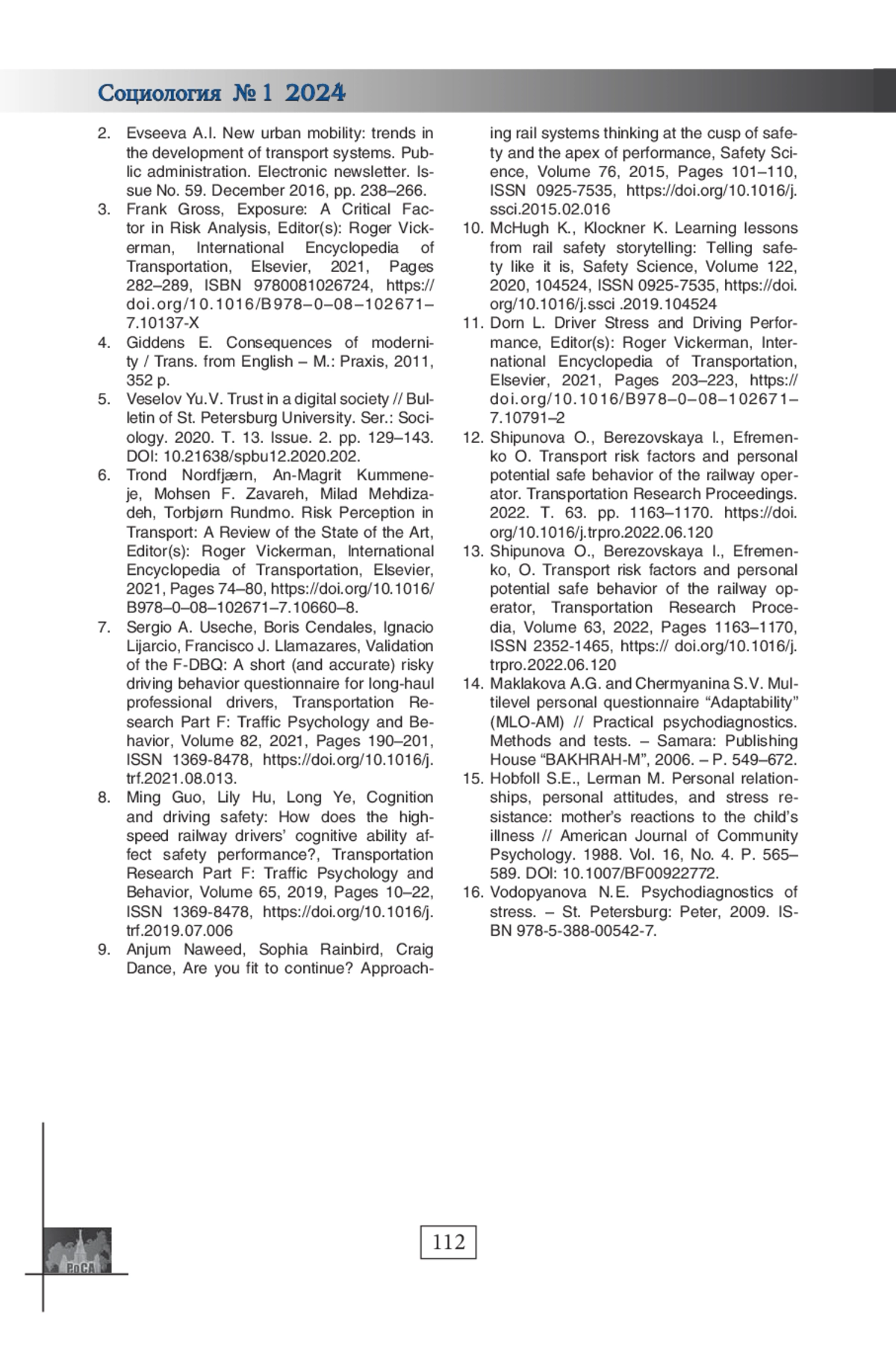 13. Shipunova O., Berezovskaya I., Efremenko, O. Transport risk factors and personal potential safe behavior of the railway operator, Transportation Research Procedia, Volume 63, 2022, Pages 1163-1170, ISSN 2352-1465,. DOI: 10.1016/j.trpro.2022.06.120 EDN: FQVOIL