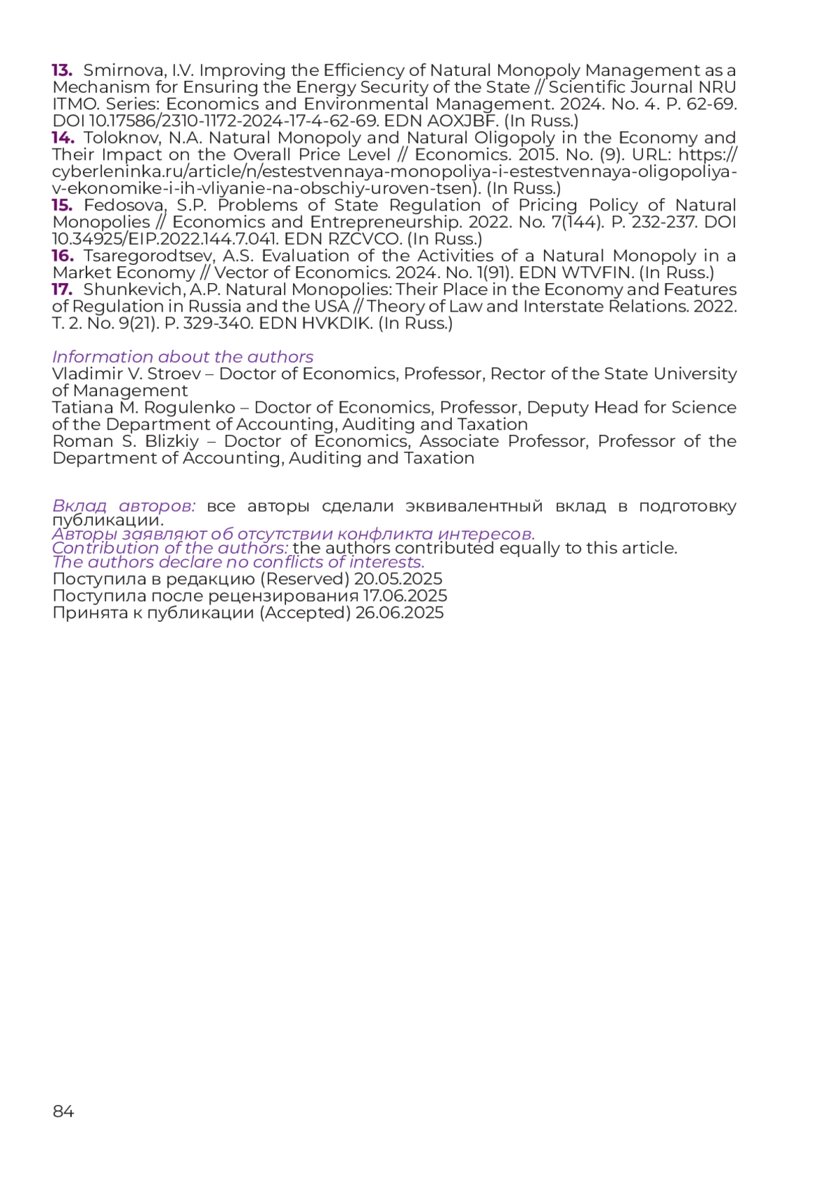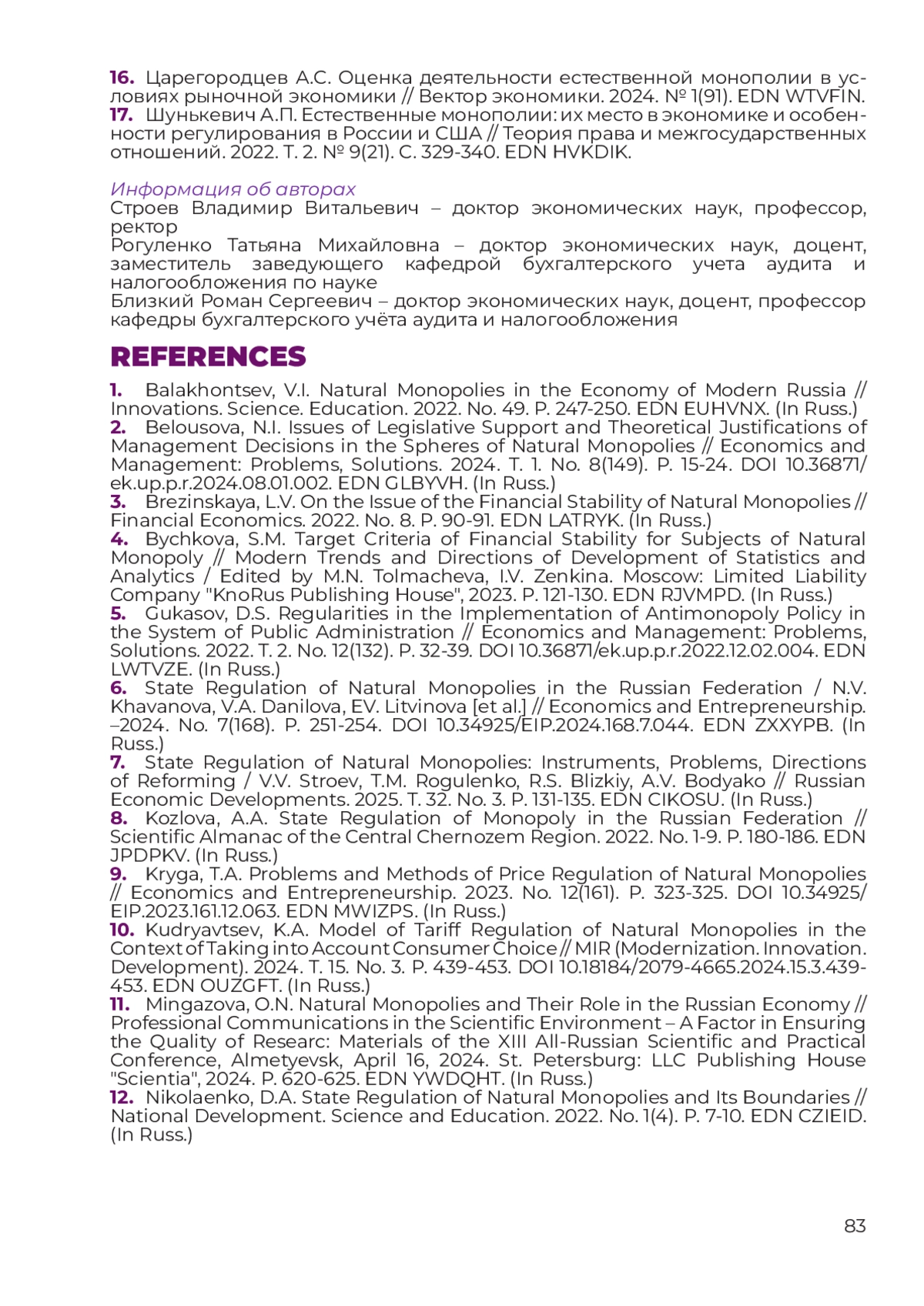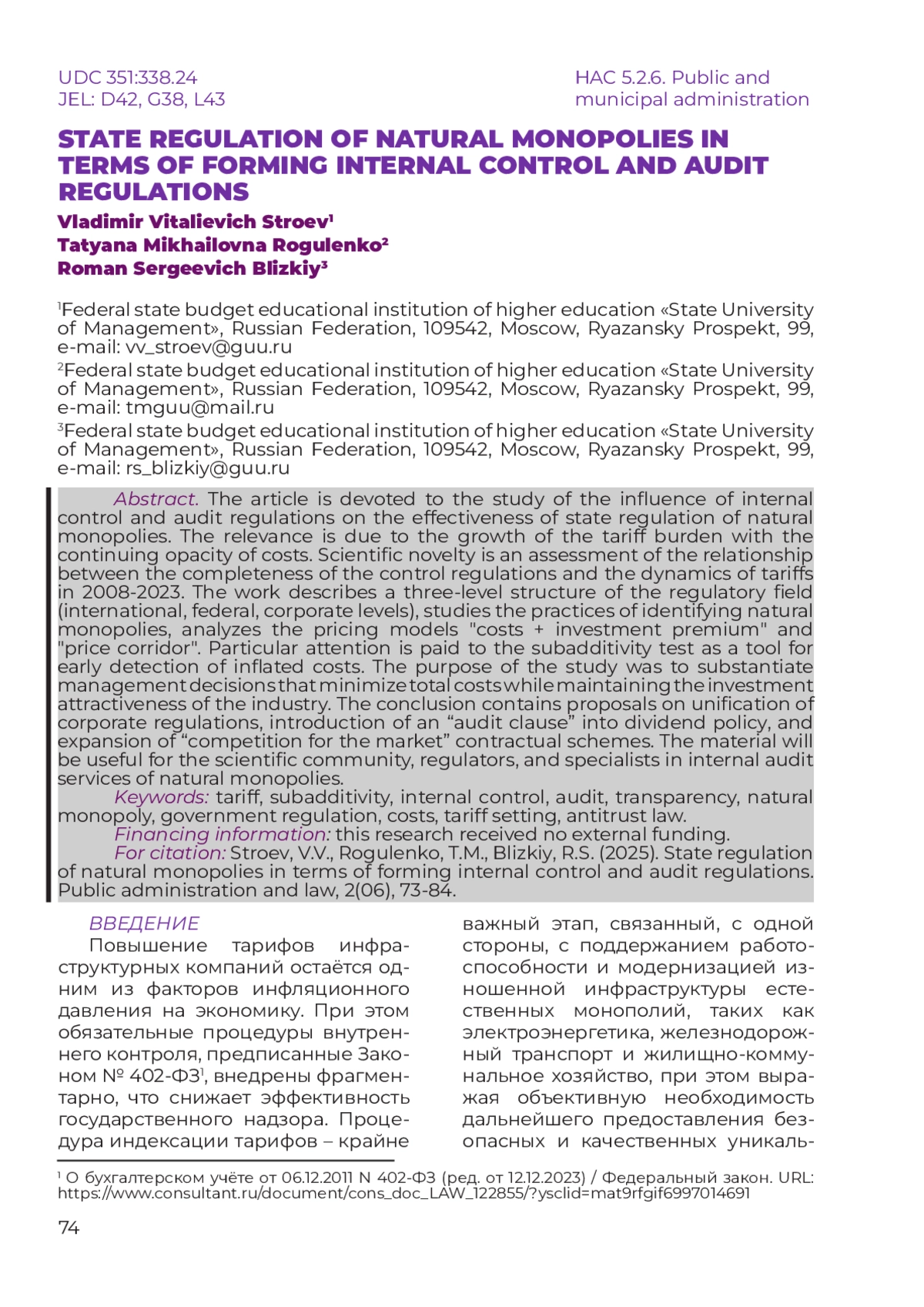Статья: ГОСУДАРСТВЕННОЕ РЕГУЛИРОВАНИЕ ДЕЯТЕЛЬНОСТИ ЕСТЕСТВЕННЫХ МОНОПОЛИЙ В ЧАСТИ ФОРМИРОВАНИЯ ВНУТРЕННИХ РЕГЛАМЕНТОВ КОНТРОЛЯ И АУДИТА (2025)