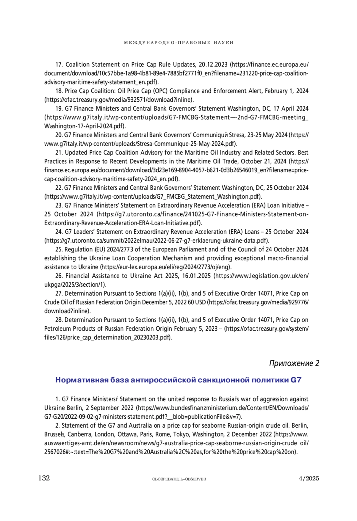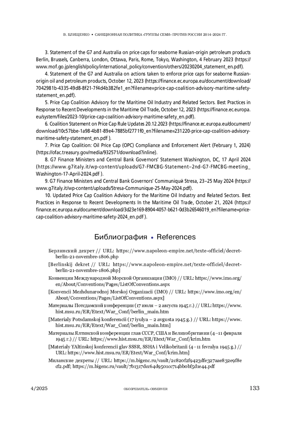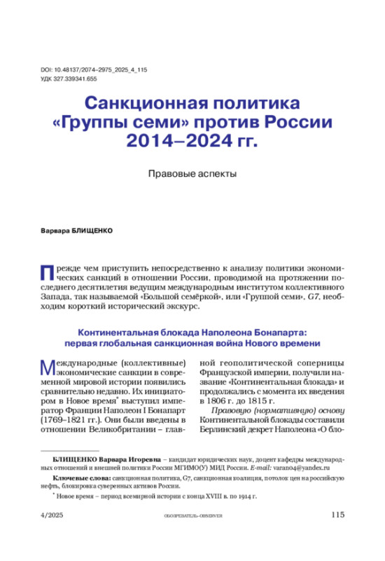 БЛИЩЕНКО В. И. САНКЦИОННАЯ ПОЛИТИКА «ГРУППЫ СЕМИ» ПРОТИВ РОССИИ 2014–2024 ГГ. ПРАВОВЫЕ АСПЕКТЫ // ОБОЗРЕВАТЕЛЬ. 2025. № 4