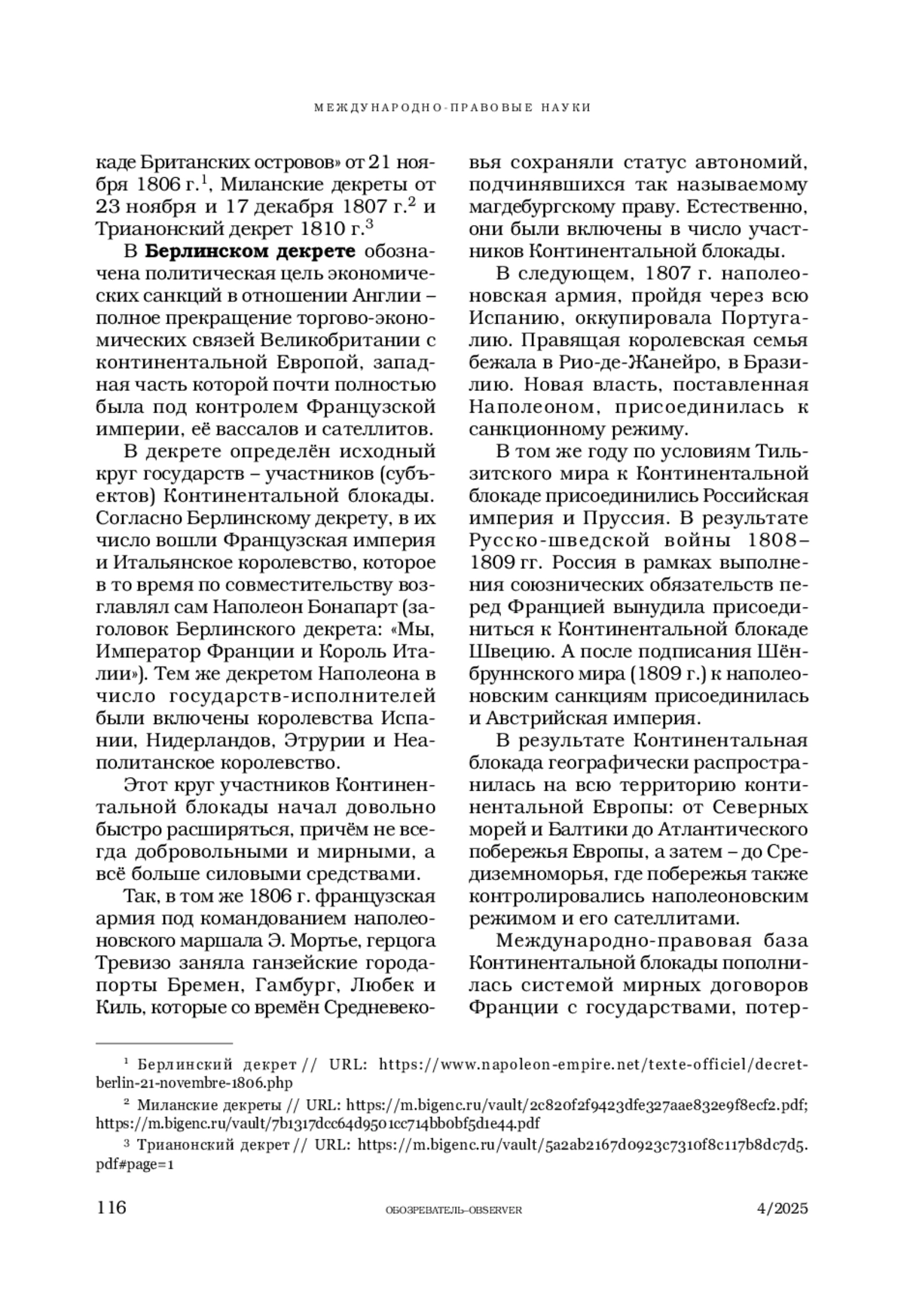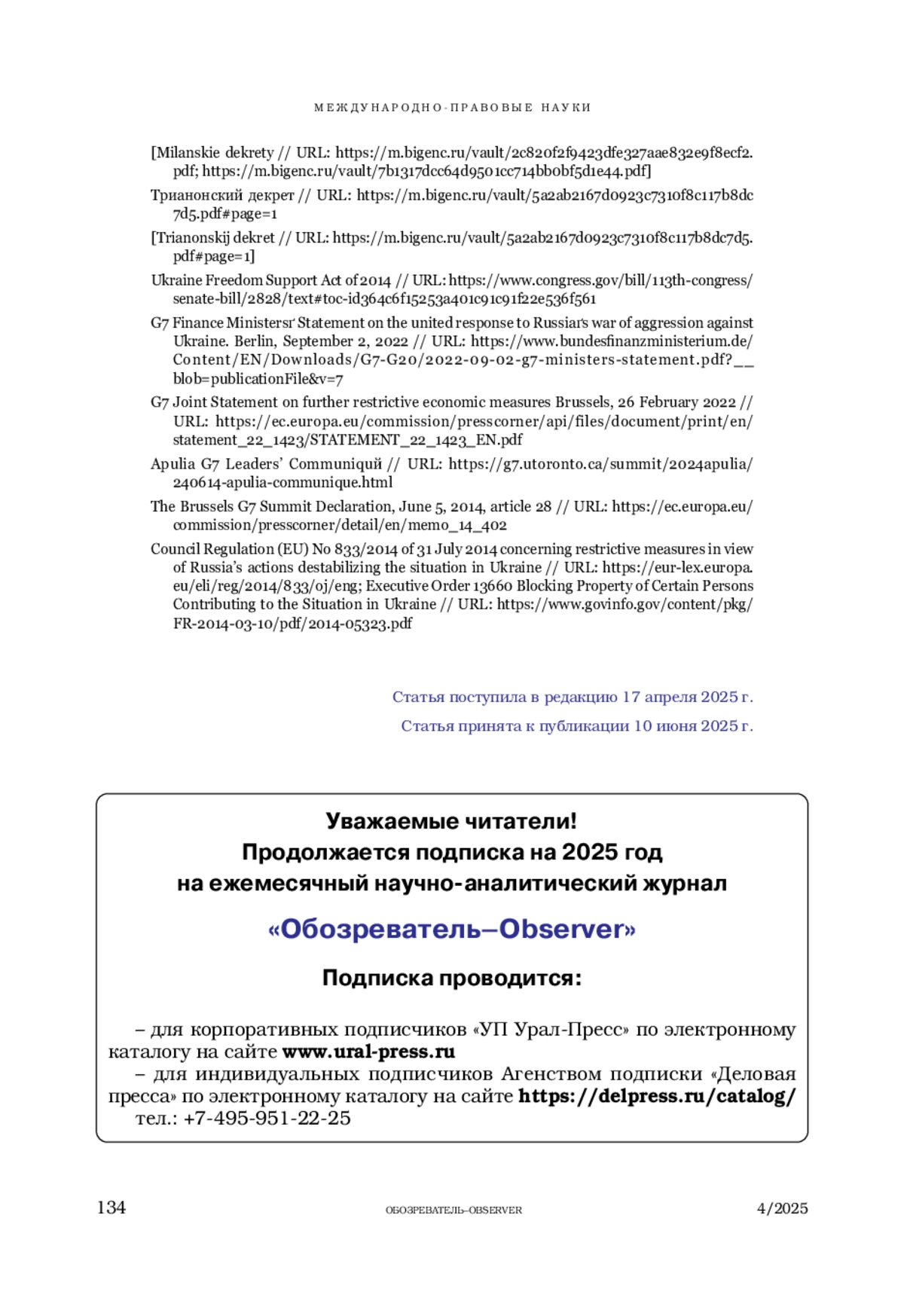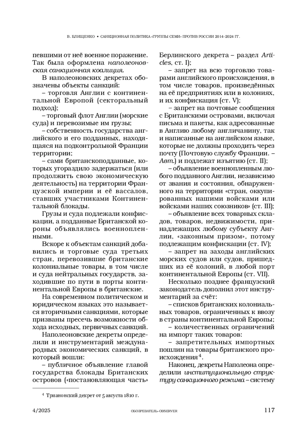 БЛИЩЕНКО В. И. САНКЦИОННАЯ ПОЛИТИКА «ГРУППЫ СЕМИ» ПРОТИВ РОССИИ 2014–2024 ГГ. ПРАВОВЫЕ АСПЕКТЫ // ОБОЗРЕВАТЕЛЬ. 2025. № 4