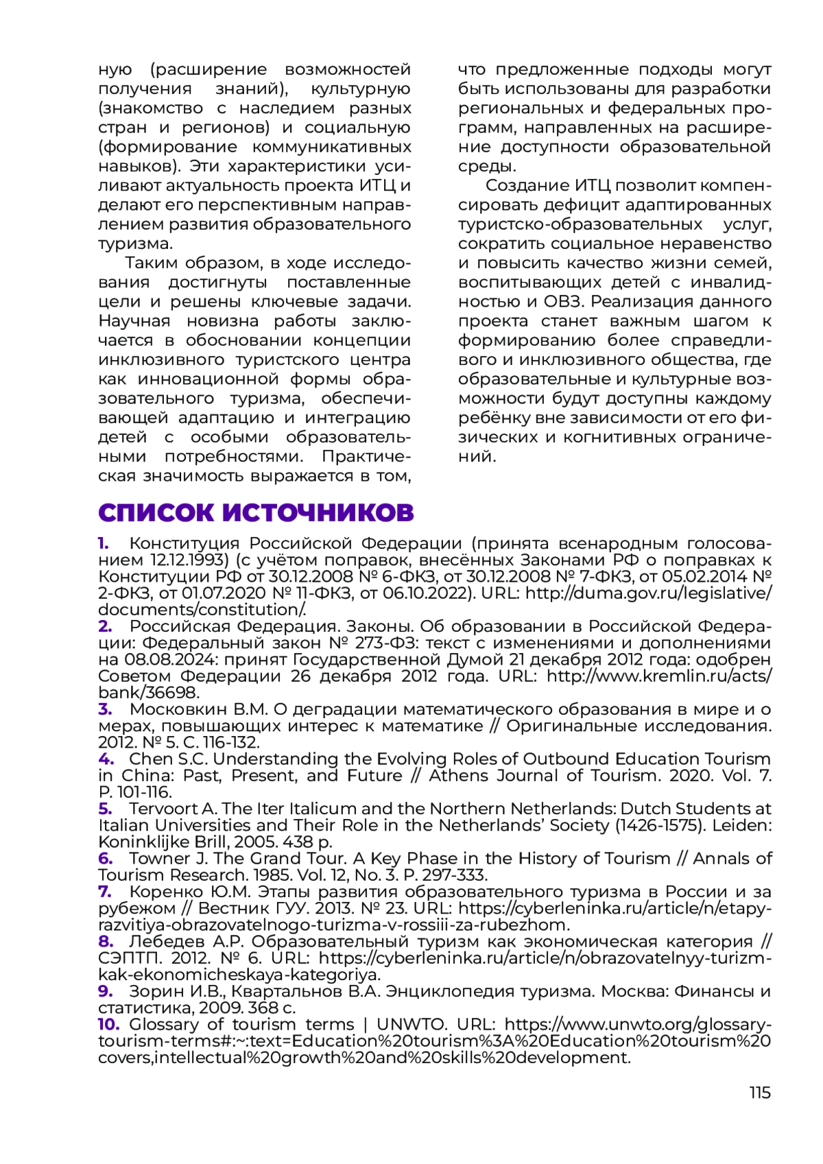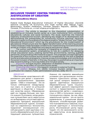 Автором обоснована необходимость интеграции инклюзивного туристского центра в систему образования как элемента, объединяющего образовательные, культурные и технологические ресурсы. Рассматриваются потенциальные направления деятельности центра: разработка виртуальных образовательных туров, создание безбарьерной среды, подготовка специалистов и информационное сопровождение. Делается вывод, что инклюзивный туристский центр способен восполнить дефицит адаптированных туристско-образовательных программ, повысить доступность знаний и способствовать социальной интеграции обучающихся, тем самым укрепляя основы формирования справедливого и инклюзивного общества.