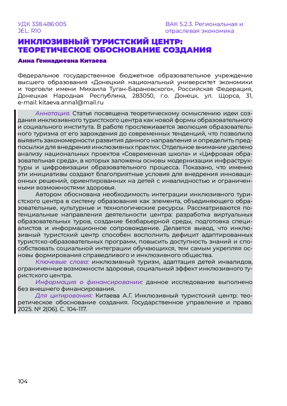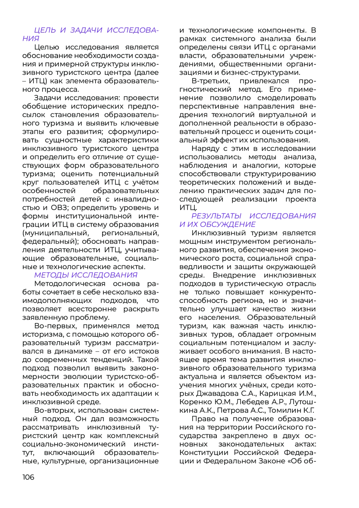 Статья посвящена теоретическому осмыслению идеи создания инклюзивного туристского центра как новой формы образовательного и социального института. В работе прослеживается эволюция образовательного туризма от его зарождения до современных тенденций, что позволило выявить закономерности развития данного направления и определить предпосылки для внедрения инклюзивных практик. Отдельное внимание уделено анализу национальных проектов «Современная школа» и «Цифровая образовательная среда», в которых заложены основы модернизации инфраструктуры и цифровизации образовательного процесса. Показано, что именно эти инициативы создают благоприятные условия для внедрения инновационных решений, ориентированных на детей с инвалидностью и ограниченными возможностями здоровья.