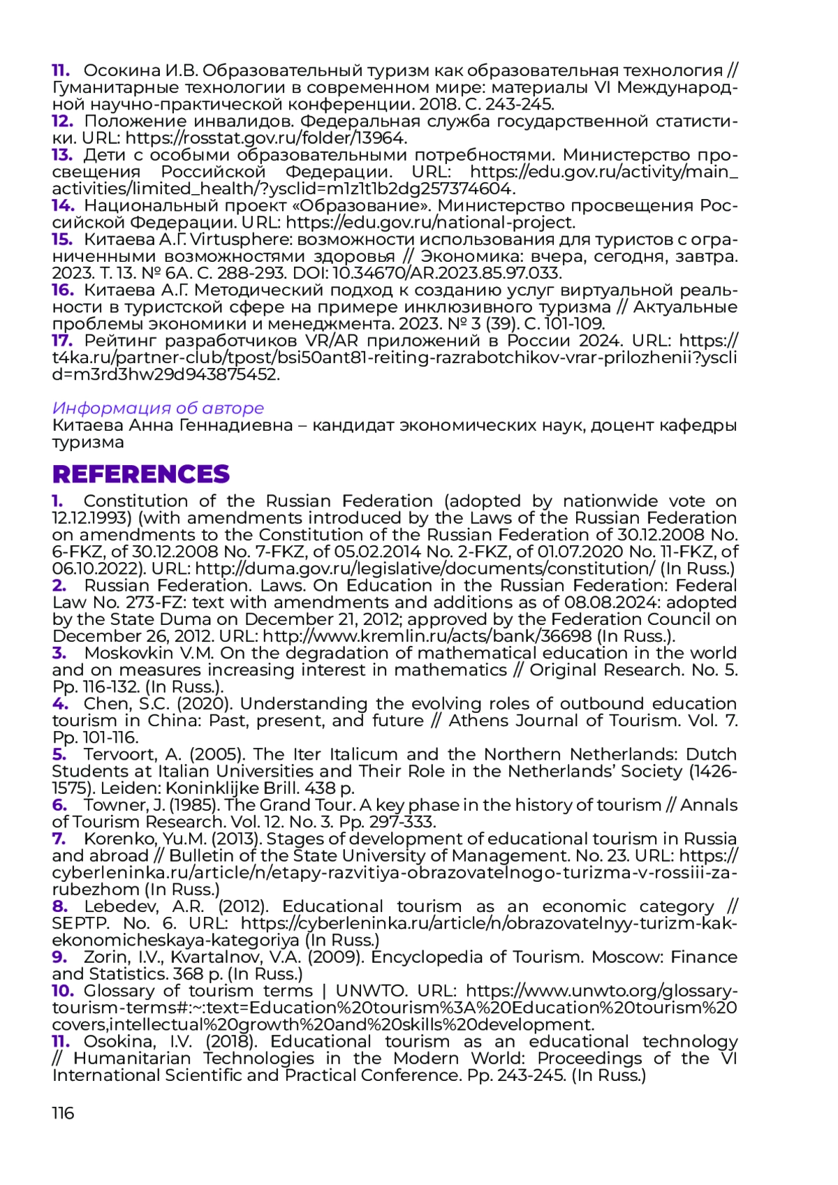 15. Китаева А.Г. Virtusphere: возможности использования для туристов с ограниченными возможностями здоровья // Экономика: вчера, сегодня, завтра. 2023. Т. 13. № 6А. С. 288-293. DOI: 10.34670/AR.2023.85.97.033