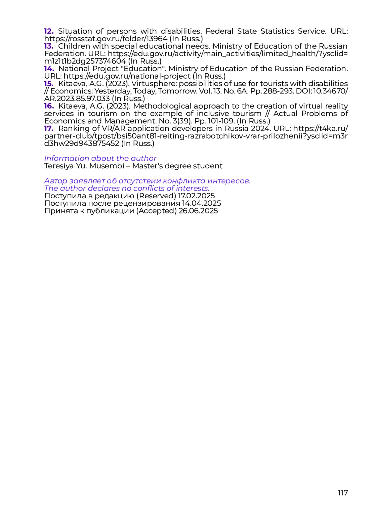 16. Китаева А.Г. Методический подход к созданию услуг виртуальной реальности в туристской сфере на примере инклюзивного туризма // Актуальные проблемы экономики и менеджмента. 2023. № 3 (39). С. 101-109.