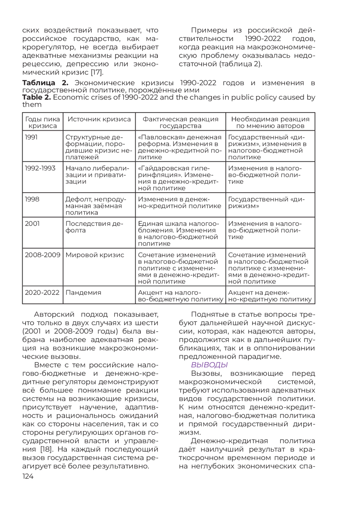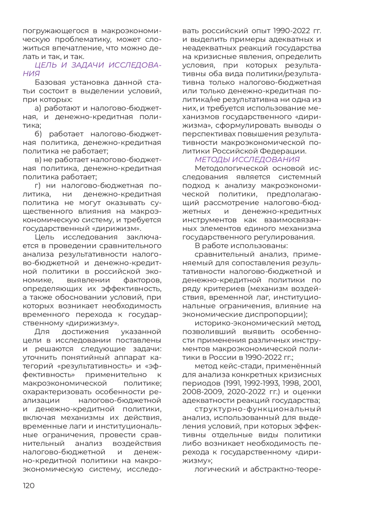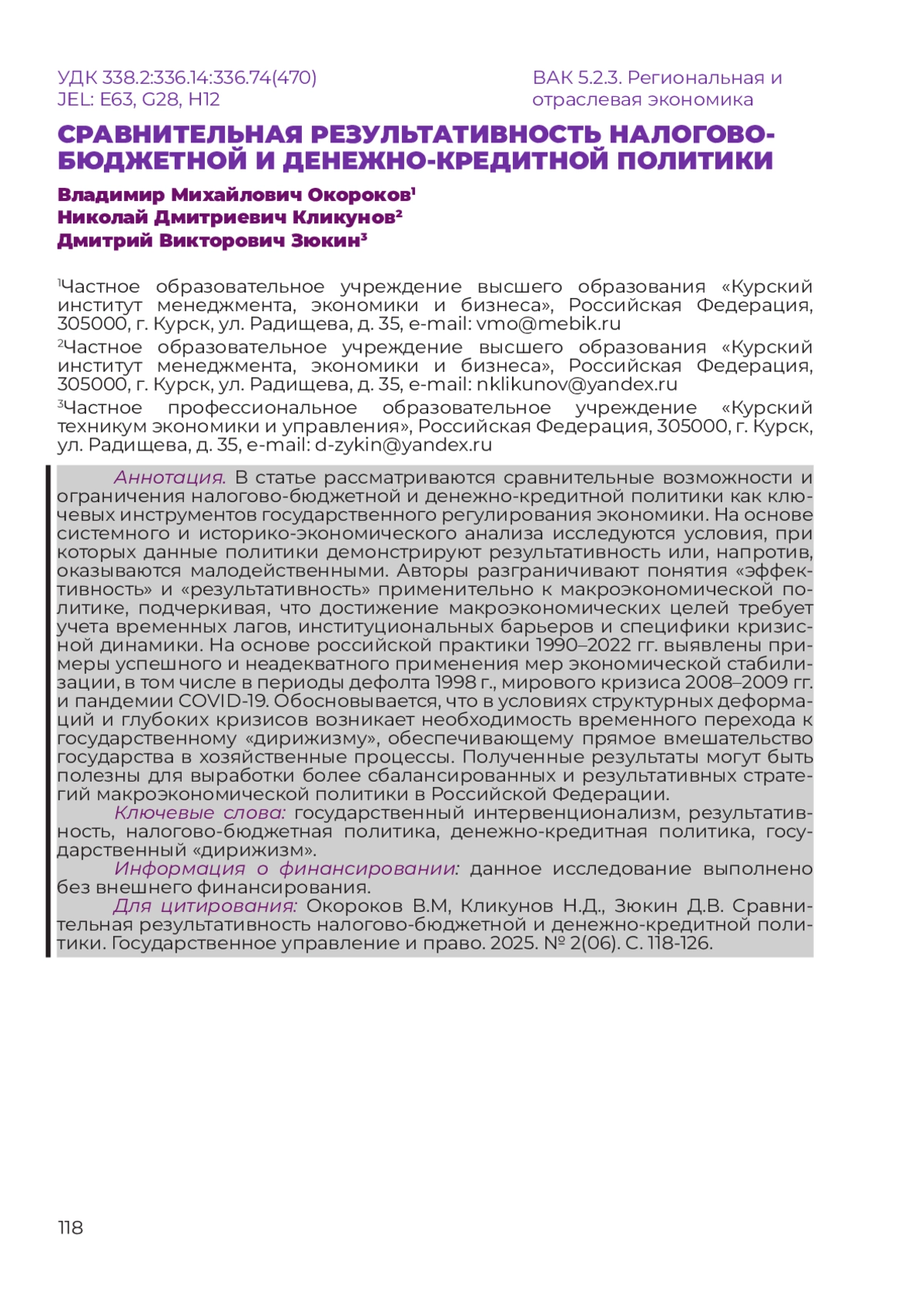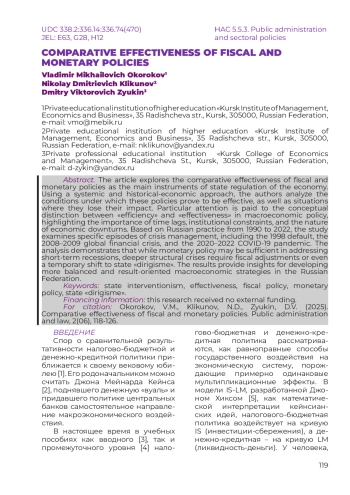 В статье рассматриваются сравнительные возможности и ограничения налогово-бюджетной и денежно-кредитной политики как ключевых инструментов государственного регулирования экономики. На основе системного и историко-экономического анализа исследуются условия, при которых данные политики демонстрируют результативность или, напротив, оказываются малодейственными. Авторы разграничивают понятия «эффективность» и «результативность» применительно к макроэкономической политике, подчеркивая, что достижение макроэкономических целей требует учета временных лагов, институциональных барьеров и специфики кризисной динамики. На основе российской практики 1990–2022 гг. выявлены примеры успешного и неадекватного применения мер экономической стабилизации, в том числе в периоды дефолта 1998 г., мирового кризиса 2008–2009 гг. и пандемии COVID-19. Обосновывается, что в условиях структурных деформаций и глубоких кризисов возникает необходимость временного перехода к государственному «дирижизму», обеспечивающему прямое вмешательство государства в хозяйственные процессы. Полученные результаты могут быть полезны для выработки более сбалансированных и результативных стратегий макроэкономической политики в Российской Федерации.