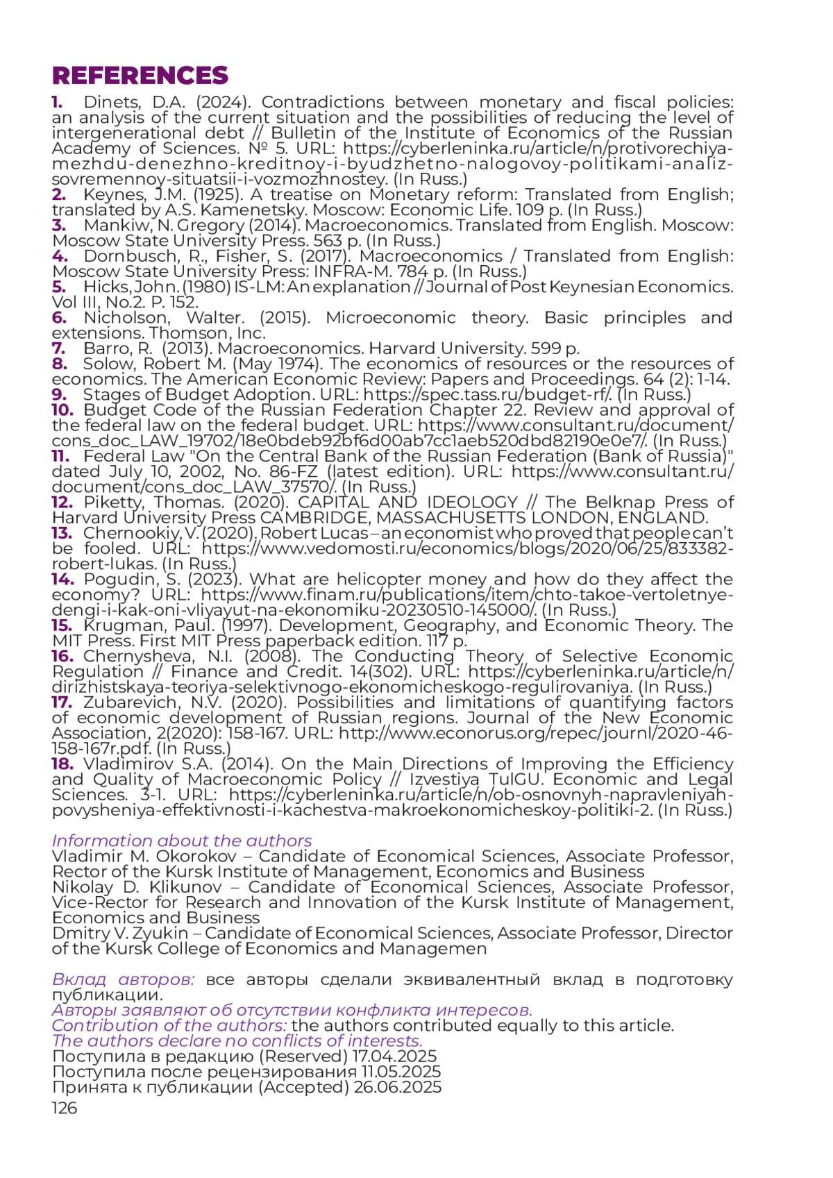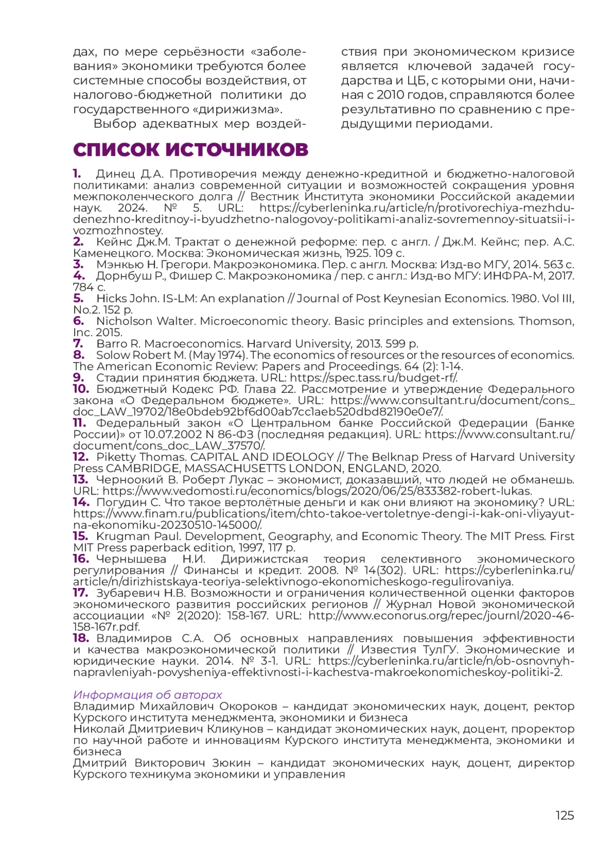 1. Динец Д.А. Противоречия между денежно-кредитной и бюджетно-налоговой политиками: анализ современной ситуации и возможностей сокращения уровня межпоколенческого долга // Вестник Института экономики Российской академии наук. 2024. № 5. URL: https://cyberleninka.ru/article/n/protivorechiya-mezhdu-denezhno-kreditnoy-i-byudzhetno-nalogovoy-politikami-analiz-sovremennoy-situatsii-i-vozmozhnostey.
