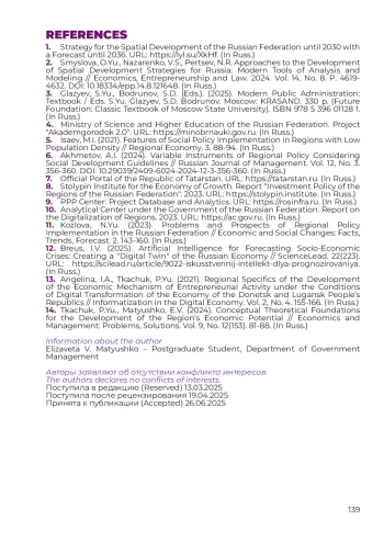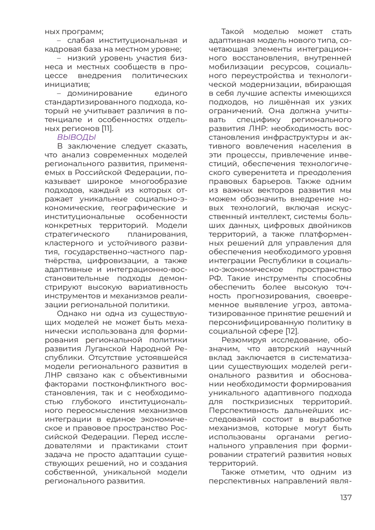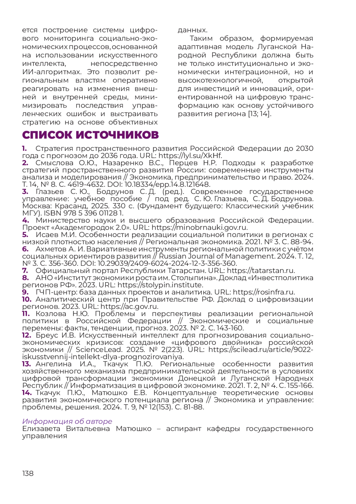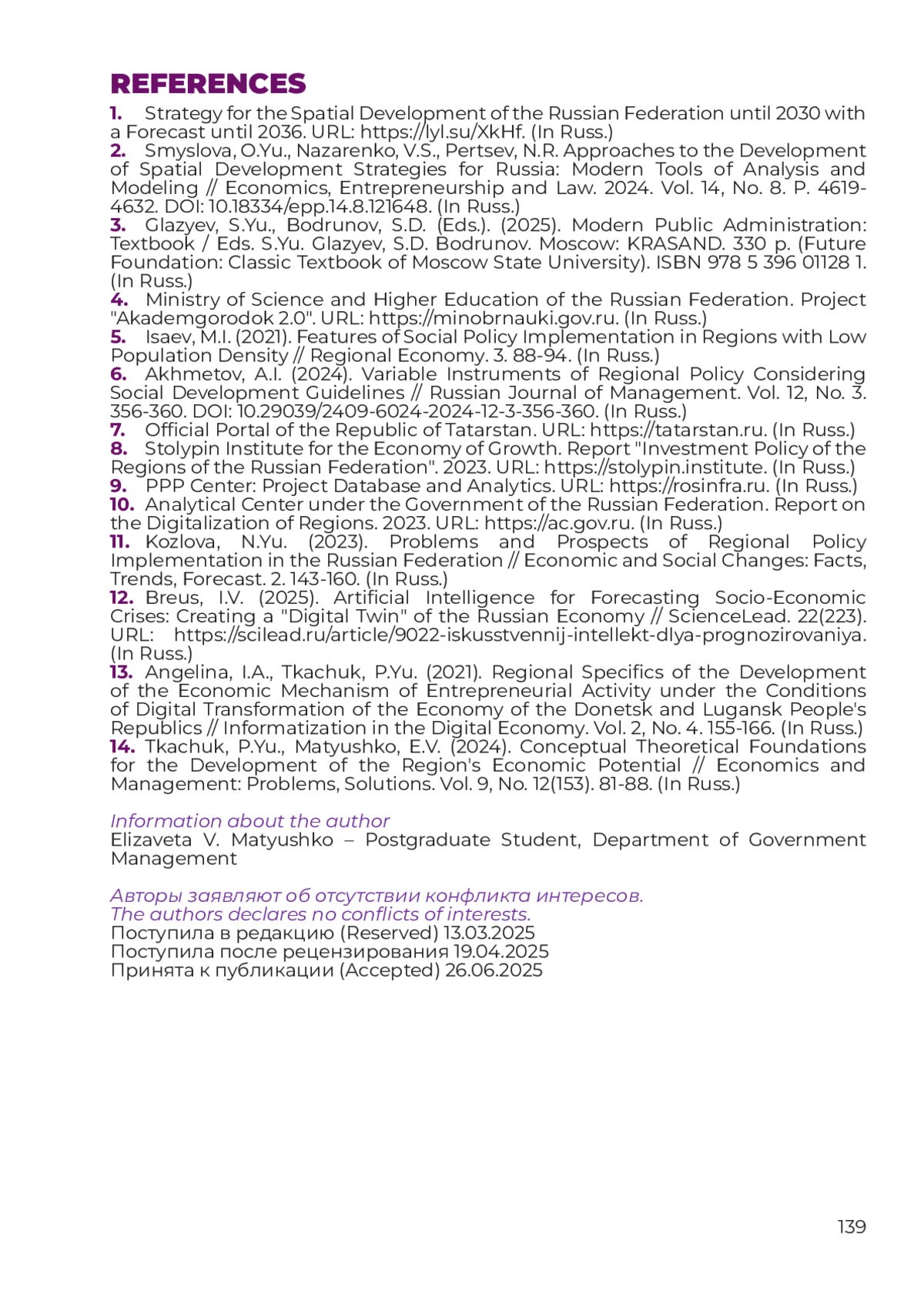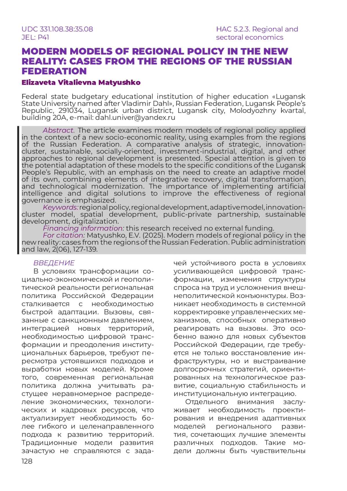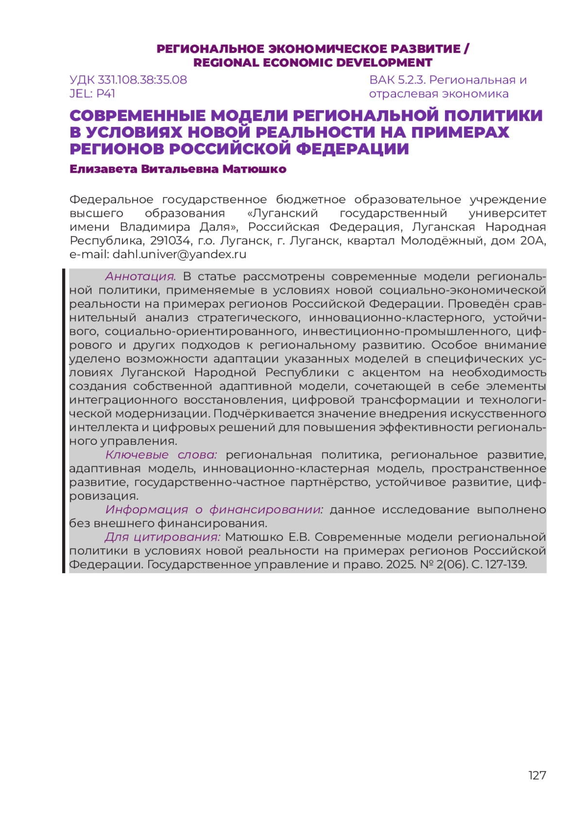 МАТЮШКО Е. В. СОВРЕМЕННЫЕ МОДЕЛИ РЕГИОНАЛЬНОЙ ПОЛИТИКИ В УСЛОВИЯХ НОВОЙ РЕАЛЬНОСТИ НА ПРИМЕРАХ РЕГИОНОВ РОССИЙСКОЙ ФЕДЕРАЦИИ // НАУЧНЫЙ ЖУРНАЛ "ГОСУДАРСТВЕННОЕ УПРАВЛЕНИЕ И ПРАВО". 2025. № 2 (6)