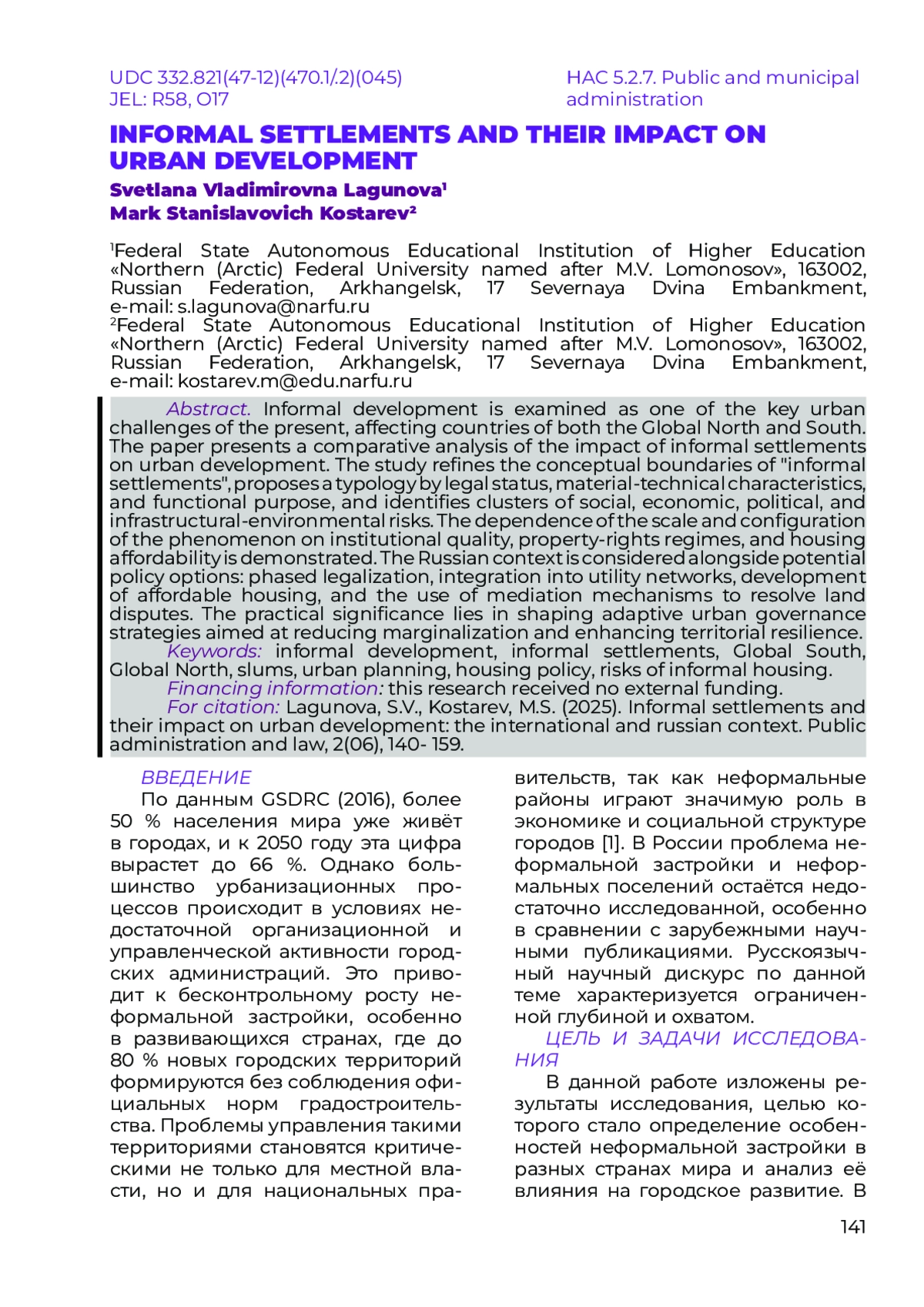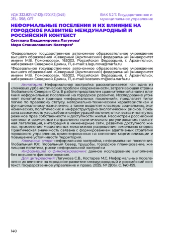 Неформальная застройка рассматривается как одна из ключевых урбанистических проблем современности, затрагивающая страны Глобального Севера и Юга. В работе представлен сравнительный анализ влияния неформальных поселений на городское развитие. Исследование уточняет понятийные границы «неформальных поселений», предлагает типологию по правовому статусу, материально-техническим характеристикам и функциональному назначению, а также выделяет кластеры социальных, экономических, политических и инфраструктурно-экологических рисков. Показана зависимость масштабов и конфигураций явления от качества институтов, режимов прав собственности и доступности жилья. Рассмотрен российский контекст и возможные направления политического регулирования: поэтапная легализация, интеграция в инженерные сети, развитие доступного жилья, применение медиативных механизмов разрешения земельных споров. Практическая значимость связана с формированием адаптивных стратегий городского управления, ориентированных на снижение маргинализации и повышение устойчивости территорий.