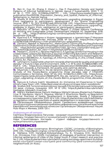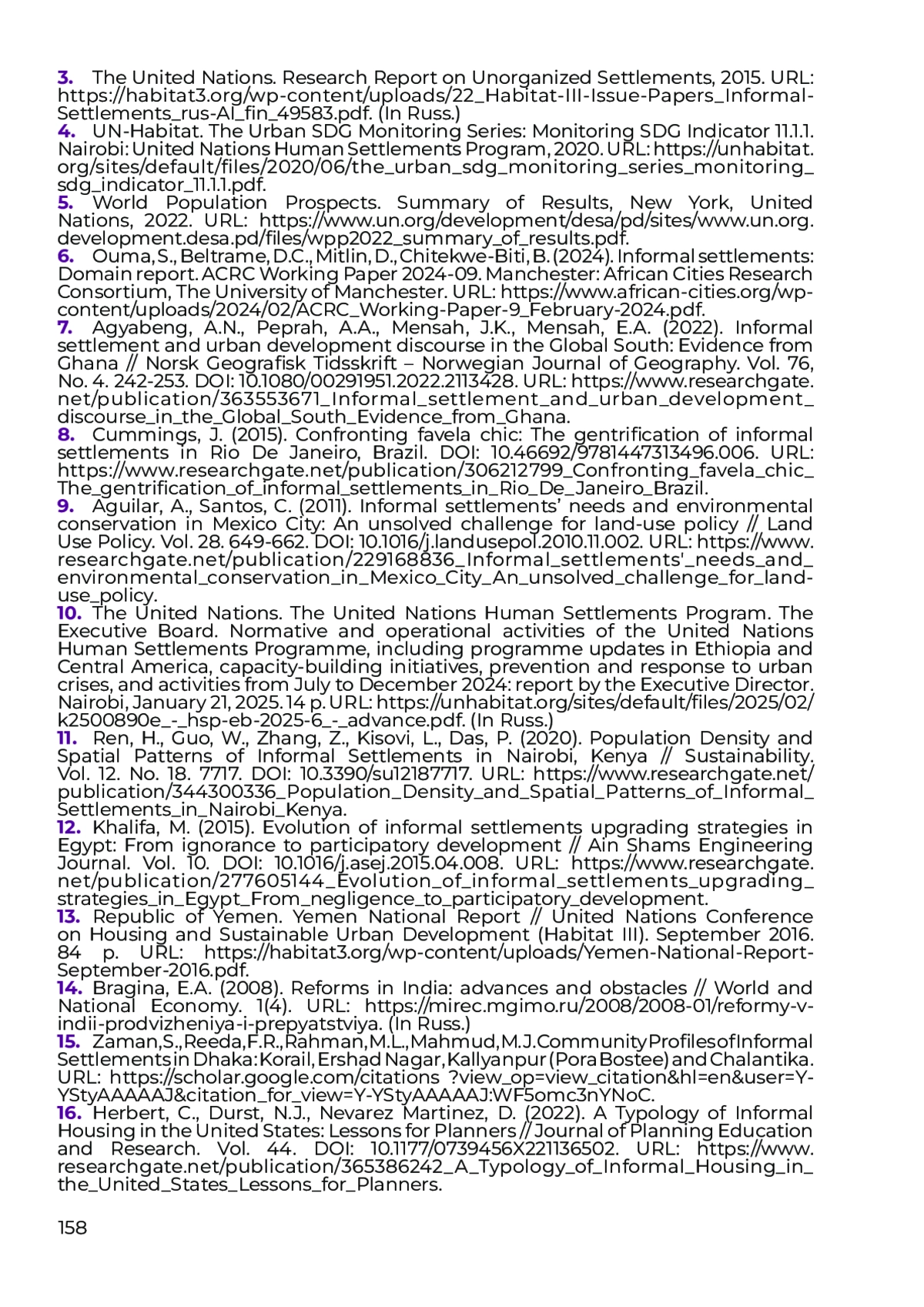 3. Организация объединённых наций. Исследовательский доклад по вопросам неорганизованных поселений, 2015. URL: https://habitat3.org/wp-content/uploads/22_Habitat-III-Issue-Papers_Informal-Settlements_rus-AI_fin_49583.pdf.
