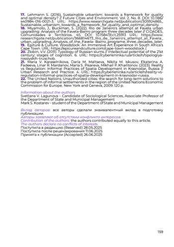 7. Agyabeng A.N., Peprah A.A., Mensah J.K., Mensah E.A. Informal settlement and urban development discourse in the Global South: Evidence from Ghana // Norsk Geografisk Tidsskrift - Norwegian Journal of Geography. 2022. Т. 76, № 4. С. 242-253. - URL: https://www.researchgate.net/publication/363553671_Informal_settlement_and_urban_development_discourse_in_the_Global_South_Evidence_from_Ghana. DOI: 10.1080/00291951.2022.2113428