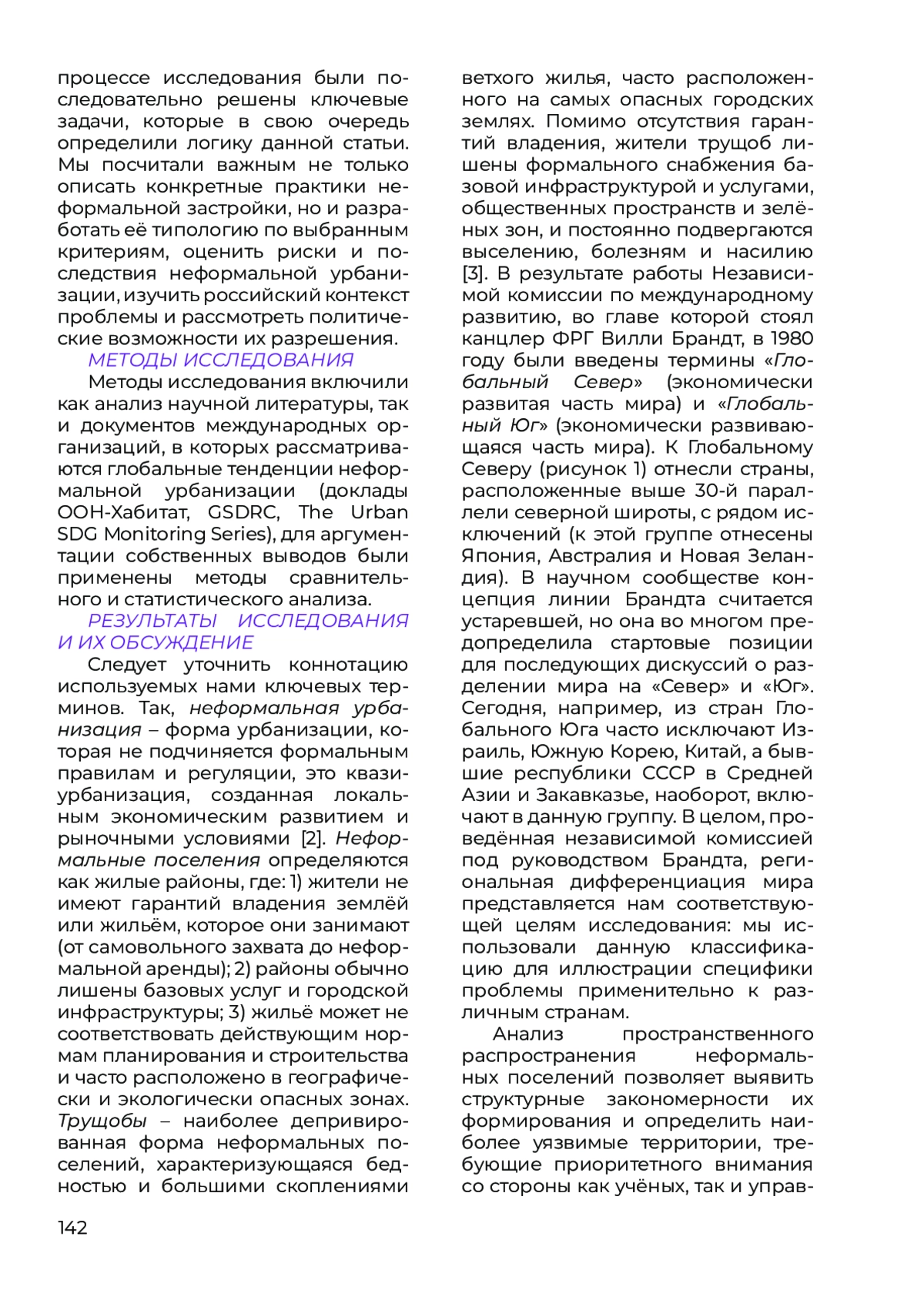 По данным GSDRC (2016), более 50 % населения мира уже живёт в городах, и к 2050 году эта цифра вырастет до 66 %. Однако большинство урбанизационных процессов происходит в условиях недостаточной организационной и управленческой активности городских администраций. Это приводит к бесконтрольному росту неформальной застройки, особенно в развивающихся странах, где до 80 % новых городских территорий формируются без соблюдения официальных норм градостроительства. Проблемы управления такими территориями становятся критическими не только для местной власти, но и для национальных правительств, так как неформальные районы играют значимую роль в экономике и социальной структуре городов [1]. В России проблема неформальной застройки и неформальных поселений остаётся недостаточно исследованной, особенно в сравнении с зарубежными научными публикациями. Русскоязычный научный дискурс по данной теме характеризуется ограниченной глубиной и охватом.