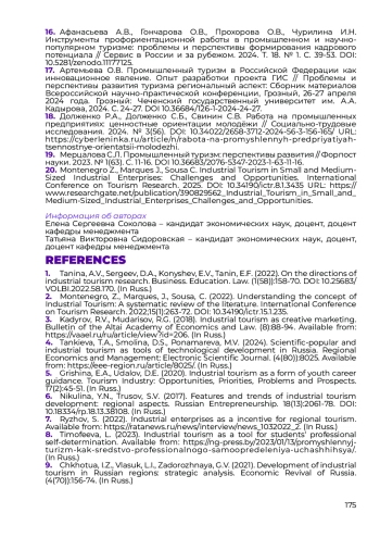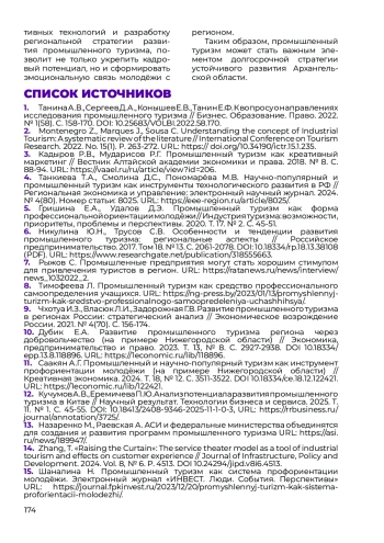 1. Танина А.В., Сергеев Д.А., Конышев Е.В., Танин Е.Ф. К вопросу о направлениях исследования промышленного туризма // Бизнес. Образование. Право. 2022. № 1(58). С. 158-170. DOI: 10.25683/VOLBI.2022.58.170