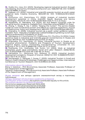 4. Танкиева Т.А., Смолина Д.С., Пономарёва М.В. Научно-популярный и промышленный туризм как инструменты технологического развития в РФ // Региональная экономика и управление: электронный научный журнал. 2024. № 4(80). Номер статьи: 8025. URL: https://eee-region.ru/article/8025/.